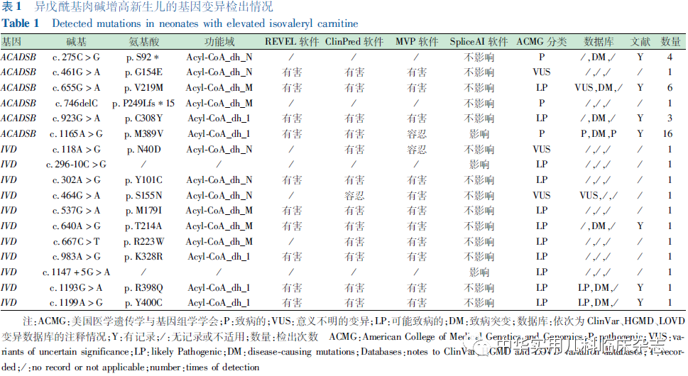 结果2.1 蛋白功能域与基因变异情况 预测结果显示,ACADSB基因包含3个功能域,分别为Acyl-CoA_dh_N (58-170位氨基酸 )、Acyl-CoA_dh_M (173-268位氨基酸)和Acyl-CoA_dh_1 (280-428位氨基酸)。IVD基因包含3个功能域,分别为Acyl-CoA_dh_N (43-157位氨基酸)、Acyl-CoA_dh_M (160-258位氨基酸)和Acyl-CoA_dh_1 (270-418位氨基酸)。34例新生儿中,16例检出ACADSB变异,涉及6种变异型(4种错义、1种无义、1种移码),其中c.1165A>G(p.M389V)为最常见的变异型(占16/32),c.461G>A(p.G154E)和c.746delC(p.P249Lfs*15)为新发现的变异型。7例检出IVD变异,涉及11种变异型,其中c.118A>G(p.N40D)、c.296-10C>G、c.302A>G(p.Y101C)、c.537G>A(p.M179I)、c.667C>T(p.R223W)、c.983A>G(p.K328R)、c.1147+5G>A为新发现的变异型。本次检出ACADSB和IVD的错义变异均位于蛋白的重要功能域,REVEL预测其中10种为有害变异,ClinPred预测其中12种为有害变异,MVP预测其中11种为有害变异。11例未检出C5代谢障碍相关基因变异。提示ACADSB、IVD基因变异是导致新生儿血C5增高的主要遗传学原因。C5增高新生儿的基因变异检出情况见表1。