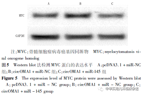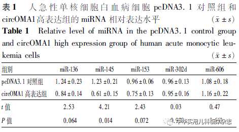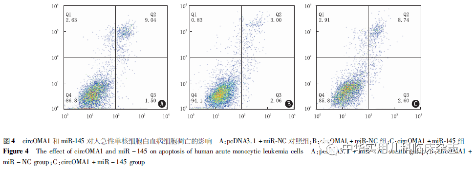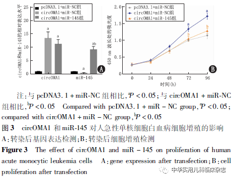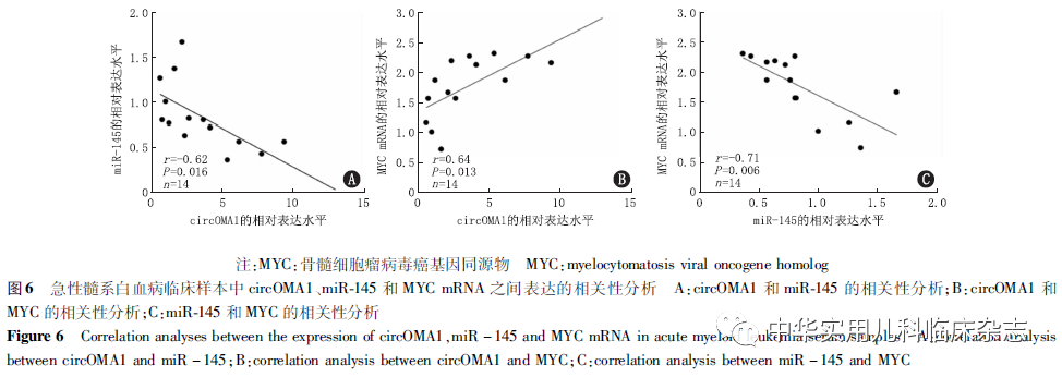 材料与方法1.1 试剂与仪器 Ficoll单个核细胞分离液购自北京索莱宝科技有限公司,DMEM培养基、胎牛血清、胰蛋白酶、TRIzol及转染试剂Lipofectamine Stem均购自美国Thermo Fisher公司;细胞计数试剂盒(CCK8)购自江苏碧云天生物技术有限公司;circRNA表达载体 pcDNA3.1(+) circRNA Mini Vector购自上海海吉浩格生物科技有限公司;miR-145 mimics及对照miR-NC购自苏州吉玛基因股份有限公司;反转录PCR(RT-PCR)试剂盒、miRNA反转录试剂盒及荧光定量检测试剂盒购自大连宝生物公司;细胞周期和细胞凋亡检测试剂盒均自美国BD公司;骨髓细胞瘤病毒癌基因同源物(MYC)蛋白抗体购自美国CST公司;增强化学发光法(ECL)显色试剂盒购自美国Bio-Rad公司。离心机及核酸分析仪均购自美国Thermo公司;QuantStudio 6定量PCR仪购自美国ABI公司;流式细胞仪购自美国BD公司,化学发光成像仪购自美国Bio-Rad公司。1.2 组织样本和细胞系 采集2016年1月至2017年1月就诊于广州市妇女儿童医疗中心的AML患儿骨髓作为样本,并将病例中治疗后达到完全缓解的初诊时和缓解后对应的骨髓样本分别作为初诊组和缓解组。治疗采用DAE(柔红霉素、阿糖胞苷、依托泊苷)或 HAD(高三尖杉酯碱、阿糖胞苷、柔红霉素)等标准化疗方案。纳入标准:(1)经临床和实验室检查确诊为AML,AML诊断分型和疗效标准参照文献[13-14],排除M3型病例;(2)患儿年龄0~16岁;(3)未患有其他类型白血病或肿瘤等恶性疾病;(4)治疗后获得完全缓解并且能够收集到足够的骨髓标本用于后续实验。排除标准:未完全缓解病例的初诊时和治疗后的样本。最终共纳入14例患儿(M2型4例、M4型3例、M5型5例、M7型2例),其中男8例(57.14%),女6例(42.86%);初诊时年龄1~16(6.6±2.7)岁。此外,纳入同一时期排除白血病和其他恶性肿瘤的血液病患儿10例作为对照组,其中男6例(60.00%),女4例(40.00%);年龄1~16岁(6.9±3.2)岁。AML患儿和对照组患儿在性别和年龄上差异均无统计学意义(均P>0.05)。AML细胞系人急性单核细胞白血病细胞(THP-1)购自中国科学院典型培养物保藏委员会细胞库。本研究通过广州市妇女儿童医疗中心医学伦理委员会批准(批准文号:2015020933),患儿监护人均知情同意并签署知情同意书。1.3 方法1.3.1 骨髓单个核细胞的采集与保存 采用Ficoll 梯度密度离心法分离骨髓单个核细胞。(1)用乙二胺四乙酸(EDTA)抗凝管收集2 mL骨髓;(2)将骨髓转入新的离心管,加入等体积磷酸盐缓冲溶液(PBS)稀释;(3)加入与稀释后骨髓等体积的分离液;(4)室温,600×g,水平离心20 min后出现分层;(5)吸取白膜层细胞至新的离心管中,PBS洗涤,250×g离心10 min;(6)弃上清液,重复洗涤、250×g离心10 min,2次,保存于-80 ℃冰箱备用。1.3.2 细胞转染 THP-1细胞采用含100 g/L的胎牛血清的DMEM培养基常规培养于37 ℃、50 ml/L CO2、饱和湿度的培养箱中。采用pcDNA3.1(+) circRNA Mini Vector 构建circOMA1的表达载体,利用 Lipofectamine stem将其单独或与miR-145同时转染THP-1细胞。单独转染circOMA1的细胞(circOMA1高表达组)采用转染pcDNA3.1空载体细胞作为对照(pcDNA3.1对照组);circOMA1和miR-145共转染的细胞(circOMA1+miR-145组)采用pcDNA3.1和miR-NC共转染的细胞作为对照(pcDNA3.1+miR-NC组、circOMA1+miR-NC组)。载体的转染浓度为1 μg/mL,miRNA的转染浓度为50 nmol/L。转染后根据需要在不同时间点收集细胞用于后续实验。1.3.3 基因表达检测 采用TRIzol试剂提取临床样本和细胞系中总RNA,核酸分析仪检测RNA浓度和纯度。通过TargetScan[15]和miRanda[16]生物信息数据库筛选出circOMA1的下游靶点miRNA(miR-136、miR-145、miR-153、miR-302d、miR-606)。取总RNA 1 μg,按RT-PCR和miRNA反转录试剂盒操作说明分别合成circOMA1、MYC和miRNA的cDNA。采用QuantStudio 6定量PCR仪检测circOMA1和miRNA的表达情况。反应程序:95 ℃预变性30 s,95 ℃变性 5 s,60 ℃退火和延伸 30 s,共35个循环。基因的表达采用2-△△CT法计算分析,circOMA1和MYC以GAPDH作为内参基因,miRNA以U6作为内参基因。circOMA1正向引物为:GAAAAGGCTGGCATGGTTCA,反向引物为:CACCATTTCCTTATGCCCCTG;MYC正向引物为:CGGGGCTTTATCTAACTCGCTG,反向引物为:ACCGAGTCGTAGTCGAGGTCA;GAPDH正向引物为:AGAAGGCTGGGGCTCATTTG,反向引物为:AGGGGCCATCCACAGTCTTC。miR-136、miR-145、miR-153、miR-302d和miR-606的正向引物分别为:ACTCCATTTGTTTTGATGATGGA、GTCCAGTTTTCCCAGGAATCCCT、TCATTTTTGTGATGTTGCAGCT、TAAGTGCTTCCATGTTTGAGTGT和AAACTACTGAAAATCAAAGAT。1.3.4 细胞增殖检测 THP-1细胞转染6 h后,收集细胞,重悬于含100 g/L胎牛血清的DMEM完全培养基中,以1×104细胞/孔的浓度铺于96孔板中,设置3个复孔。分别于0 h、24 h、48 h、72 h和96 h使用CCK8试剂盒检测细胞活性,每孔加10 μL CCK8,37 ℃孵育2 h,然后利用酶标仪测定450 nm波长处的吸光度,根据同一时间点同一组内复孔的检测值计算平均值。1.3.5 细胞凋亡检测 THP-1细胞转染72 h后,300×g离心5 min收集,按Annexin V-FITC/PI细胞凋亡试剂盒说明书进行操作:(1)用预冷的PBS洗涤2次,300×g4 ℃离心5 min;(2)弃上清液,加入100 μL染色缓冲液,重悬细胞;(3)加入5 μL Annexin V-FITC和10 μL PI染色液,室温、避光孵育10 min;(4)加入400 μL缓冲液,混匀后置于冰上,1 h内用流式细胞仪检测凋亡。采用FlowJo软件进行数据分析。进行3次独立重复实验。1.3.6 Western blot法检测MYC蛋白水平 THP-1细胞转染72 h后,250×g离心10 min 后收集,预冷的PBS洗2次,加入细胞裂解液冰上裂解 20 min,12 000×g离心15 min提取总蛋白,采用二辛可酸(BCA)法检测其浓度。取 30 μg 蛋白进行聚丙烯酰胺凝胶电泳、转膜;50 g/L脱脂乳室温封闭2 h,弃封闭液后