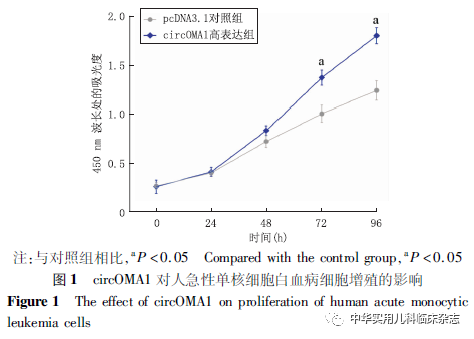 急性白血病(AL)是儿童最常见的肿瘤性疾病。其中,急性髓系白血病(AML)约占20%,但其致死率却占儿童AL的50%以上[1-2]。虽然,随着诊疗技术和医疗水平的提高,AML的治疗已有较大改善,但仍存在预后差及易复发的治疗困境[3]。因此,研究AML的发病机制及发现新的治疗靶点极为重要[4]。有研究发现,环状RNA(circRNA)在肿瘤等疾病的发生发展中发挥重要作用[5-6]。circRNA是一类由线性RNA的5′端和3′端首尾相连结合在一起后形成的环状闭合RNA[7],其可通过阻断microRNA(miRNA),与蛋白结合或翻译成功能蛋白等方式发挥作用[8-9]。研究表明,hsa_circ_0121582、hsa_circ_0004277、circMYBL2等circRNA在AML中均产生作用,并具有成为生物标志物的潜能[10-12]。目前,尚未见有关于circOMA1(has_circ_0000072)在AML中的相关研究。本研究对circOMA1在AML中的表达和功能进行探讨,以期为AML的治疗和诊断提供新的理论依据。