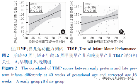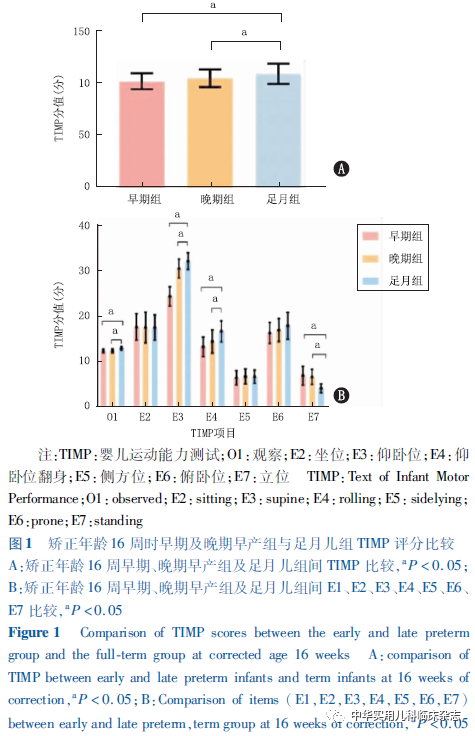 讨论3.1 目前国内早产儿运动评估的现状和困境 婴儿运动技能是在中枢和外周神经元参与下,骨骼和肌肉协调完成的,是神经系统发育的主要体现形式[11]。目前临床发现早产儿脑损伤的方法主要是通过运动进行评估[12]。然而我国起步晚,相关临床数据少,且多为近年陆续从国外引入,所以使用普及度低且缺乏使用有效性和指导意义的数据。目前国内应用较多的适用于婴儿的运动评估方法[12-13] 主要有全身运动(GMs)评估、TIMP、新生儿行为观察法(NBO)、新生儿行为神经测定(NBNA)、Alberta婴儿运动量表(AIMS)、Hammersmith婴儿神经检查(HINE)、Peabody运动发育量表(PDMS)、粗大运动功能测试量表(GMFM)等。这些方法虽都适用于婴儿,但适用年龄段有一定差异,评估内容的侧重点和目的也存在不同。其中适用于早产儿的方法有GMs、TIMP和NBO,其余方法仅从足月儿开始使用。HINE主要通过颅神经、肌张力、姿势、运动、反射和反应的评估对神经系统发育现状和预测[14],NBNA通过运动、反射、肌张力、姿势等对0~12月龄婴儿脑损伤的早期识别[15],PDMS主要通过粗大运动和精细运动评估 0~72月龄儿童的运动发育水平[16]。AIMS通过观察 0~18月龄儿童自主运动,获取粗大运动发育在正常同龄儿中所占的百分比[17]。GMFM主要用于评估脑性瘫痪患儿的粗大运动功能[18]。适用于早产儿的3种方法中,GMs是一种预测早产儿神经系统损伤的评估方法,“痉挛同步性”和“不安运动缺乏”这2种特征对痉挛型脑性瘫痪预测敏感度达98%以上[19]。该方法不对患儿的运动发育是否落后作出具体判断,对早期干预的指导意义较弱[20]。NBO通过18项神经行为学的观察来描述婴儿的行为能力,主要用于指导父母适当的回应照顾,其对运动落后的干预意义同样较弱[21]。TIMP可用来对早产儿进行运动发育落后情况进行评估,并针对性地进行干预[22]。TIMP在早产儿运动发育评估及干预中的作用突出,陈艳妮教授团队首次将第5版英文版TIMP(http://thetimp.com)引入我国,于2014年正式发表了第1篇基于我国儿童数据的研究文章[23]。国内外很多学者针对TIMP与其他神经发育评估方法进行了对比,表明TIMP对早产儿运动发育评估信效度良好[10,14,24],且对其远期运动、神经发育结局具有良好的预测效度[25]。马雪玲等[26]针对TIMP对早产儿运动发育异常的早期诊断价值进行了文献回顾,也得到了一致的结论。然而,由于TIMP引入国内较晚,临床研究数据少,故测评结果对临床指导意义不足,需要加大研究力度。3.2 早产儿运动发育的特点及干预措施 本研究发现,早期早产儿和晚期早产儿在胎龄40周、矫正年龄16周时TIMP评分呈正相关,提示早期早产儿和晚期早产儿胎龄40周TIMP测评结果对矫正年龄16周的运动发育的评估有预测意义。进一步研究发现,矫正年龄16周时早期早产儿与晚期早产儿运动发育评分较健康足月儿均有差异;巴西学者应用TIMP方法评估胎龄40周早产儿与足月儿运动发育特点,发现早产儿TIMP总评分均低于足月儿,提示早产儿的早期运动发育特点与同龄足月儿有差异[20],本研究结果与之一致,因此,需要对早产儿运动发育进行早期评估及干预指导。本研究发现早产儿矫正年龄16周时TIMP评分与足月儿差异主要表现在以下4个方面;(1)早产组O1(观察)评分较足月儿低(P<0.05)。观察项目反映了婴儿自发性运动,包括头保持中线位、下肢抗重力运动,踢腿、孤立的手指和脚踝运动等。较多研究显示,由于生命早期早产儿神经系统发育的成熟度落后于足月儿,他们的感知觉能力及肌肉力量较足月儿弱,使得头部中线控制、上肢和下肢流畅的摆动、末端的分离运动等对感知觉要求较高的自发运动落后,提示感知觉能力和肌肉力量的干预是早产儿早期干预的重要内容。(2)早产儿E3评分较足月儿低(P<0.05),主要是仰卧位下保持头部中线和上肢中线运动能力较弱。中线运动成熟是人体压力中心(COP)稳定的表现,COP是神经系统通过控制肌肉活动实现身体平衡的质量中心点,头尾和内外位移是COP很重要的2个移动方向。Fallang等[21]通过运动力学分析发现早产儿在矫正年龄4个月时COP位移内向外侧方向较足月儿明显增加,而头尾方向位移较少,易出现仰卧位伸展姿势,不利于中位线运动的出现,本研究结果与之一致,也提示仰卧位中位线的运动模式输入是早产儿早期干预的主要内容之一。(3)早产儿组E4评分较足月儿低(P<0.05),与国外学者研究结果相近。澳大利亚学者通过AIMS的评估中发现,矫正年龄4月龄时早产儿较足月儿躯干主动伸肌较屈肌更有优势[22],而无论是诱导上肢还是诱导下肢的仰卧位翻身,都主要需要主躯干屈肌来完成。这也提示对于早产儿的运动早期干预,促进躯干屈肌能力发育是一项重要内容。(4)早产儿组E7评分较足月儿高,主要是E7的躯干稳定伸展和支撑能力,这与巴西学者对早产儿及足月儿出生第1年发育轨迹的研究结果一致[27]。4月龄时部分原始反射仍存在(早产儿存在更明显),随意运动也开始出现(早产儿出现相对晚),所以立位站立时支撑反射和躯干屈肌伸肌的随意协同拮抗均起了作用。相较于足月儿,站立时的重力刺激下躯干支撑反射的应对在早产儿中占主导作用,这可能是站立位评估分值高的主要原因,同时要意识到并非早产儿站立位时躯干屈和伸肌能力协同拮抗能力强,不能忽视这方面能力的早期干预。3.3 早产儿干预指导的重要性 儿童早期发展工作不仅决