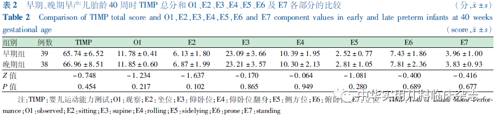 结果2.1 胎龄40周时早期与晚期早产儿TIMP的差异分析 早期、晚期早产儿胎龄40周时TIMP总分和O1、E2、E3、E4、E5、E6及E7各部分值差异均无统计学意义(均P>0.05)(表2)。