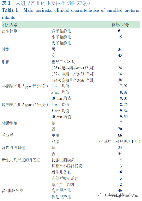 资料与方法1.1 研究对象及分组 2019年6月至2021年7月在三二〇一医院出生并长期随访的新生儿,纳入标准:(1)早期早产儿组39例,胎龄≤33+6周;(2)晚期早产儿组38例,34周≤胎龄≤36+6周;(3)足月儿组43例,37周≤出生胎龄≤41+6周出生,围生期及出生后均无异常,后续跟踪评估均正常;(4)研究类型:前瞻性研究;(5)排除标准:先天发育畸形、遗传代谢疾病等先天性疾病除外。本研究通过三二〇一医院医学伦理委员会批准[批准文号:院伦理审(2019)003号],参加此研究的婴儿监护人均知情同意,并签署知情同意书。入组早产儿的人口特征及主要围生期临床特点见表1。