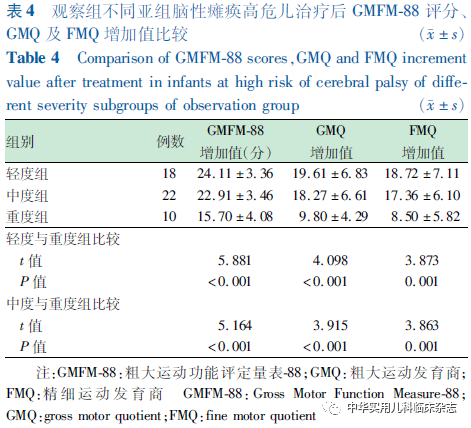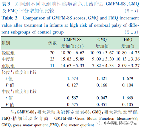 讨论随着产科及新生儿重症监护综合干预技术的提高,脑损伤儿的存活率显著增加,脑瘫患病率未明显降低。目前对于脑瘫,尚无特效治疗手段,诊断为脑瘫的平均年龄为19个月,早期诊断、早期干预对于改善脑瘫患儿临床结局至关重要。2017年Novak 等题为《脑性瘫痪早期精准诊断与早期干预治疗进展》的系统评价,明确提出可以将诊断时间提前至纠正胎龄6月龄以内[12-13]。一旦诊断为脑瘫或脑瘫高危儿,应立即进行符合年龄要求的个体化干预[6,14]。洪永锋等[15]对不同时机开始康复干预对2岁前脑瘫及其高危儿粗大运动疗效的研究发现, 在出生后3个月内开始正规康复的疗效最佳,出生后3~6个月开始正规康复的疗效次之,仍较理想;出生后6~12个月和出生后12~24个月才开始正规康复的疗效依次递减。因此,脑瘫高危儿及早进行正规康复干预尤其重要。发育中的脑较成人的神经可塑性更强,脑功能重塑受病理生理及环境因素的共同影响。世界卫生组织(WHO)发布的《国际功能、残疾和健康分类-儿童与青少年版》(International Classification of Functioning,Disability and Health,Children and Youth Version,ICF-CY)为儿童康复奠定了理论基础,其中明确强调了个人与环境因素对儿童康复的重要性。2014年Morgan教授团队首次报道GAME方案,对脑瘫高危儿的早期干预发现,GAME方案可有效改善脑瘫高危儿的运动结局[3]。该团队2015和2016年相继发表2篇文章,进一步证实GAME方案可有效改善0~12月龄脑瘫高危儿的运动轨迹,尤其是轻-中度脑瘫高危儿[4,16]。GAME方案设计的核心要素包括目标导向性强化运动训练、家庭项目、父母教育和环境丰富。强调针对特定任务下的练习,激发患儿自发产生的主动运动,高强度地练习生活中的任务和活动,其作用机制是体验依赖的神经可塑性。父母是孩子最好的老师,指导并鼓励家长参与到孩子个体化的训练中,并形成家庭项目,教给父母最大程度利用孩子的清醒时间,提供孩子自然学习机会。构建丰富的运动游戏环境,提供与目标有关的实践活动的物理场所,利于设定负重、够取和抓握任务。有文献已经明确了运动干预的有效性[17],推荐有效的绿灯措施包括目标导向性训练、家庭计划、环境强化等。GAME方案的设计理念以运动学习理论为基础,核心要素充分利用了“活动” 和“经验” 依赖性神经可塑性原理,符合ICF-CY框架理论和早期干预的最新理念,且具备低成本、安全有效的优越性。目前,我国脑瘫高危儿早期规范化干预方案尚存在较多问题,不乏缺乏循证支持的干预手段。GAME方案作为一个尚未普及的早期干预手段,其具体实施策略在我国应用的经验尚少,目前有关GAME疗法的本土研究鲜见报道。苑爱云等[18]对3~12月龄轻、中度发育障碍患儿进行研究,观察组和对照组在常规康复训练的基础上,分别增加GAME方案和神经发育学疗法进行干预8周,发现与神经发育学疗法相比,GAME疗法能更好地改善轻中度发育障碍婴儿的运动功能,且较小年龄组的患儿进步较快。吴德等[19]的研究发现GAME疗法和NDT疗法对脑瘫高危儿的粗大运动和精细运动均有显著疗效,但GAME疗法对认知发育的改善优于NDT疗法,并可降低脑瘫的发生率。本研究发现,观察组的GMFM-88、GMQ、FMQ评分均明显高于对照组,且治疗后观察组不同亚组各评分增加值组间比较,轻度组及中度组均较重度组显著增加(均P<0.05)。提示GAME方案较传统康复治疗能更有效地促进脑瘫高危儿的粗大运动及精细运动功能,且对轻-中度脑瘫高危儿的疗效更优,这与吴德等[19]及Morgan 教授团队的研究结果相类似[3-4]。Brando等[20]尝试将GAME方案应用于巴西先天性寨卡病毒综合征婴儿(0~12个月),评估GAME方案对先天性寨卡病毒综合征导致的脑瘫高危婴儿的影响;这项小样本的试验性研究发现, GAME组与标准照护组相比,婴儿的运动和认知能力改善方面无显著差异。作者分析,可能与样本量小、入组患儿病情重,研究周期短有关。上述研究某种程度上亦提示GAME方案在改善轻中度脑瘫高危儿运动结局的优越性。本研究引入2014年Morgan等[3]创建的GAME干预方案,融入了目标导向性训练、家庭参与、环境丰富、主动活动等多个元素,发现可有效改善轻中度脑瘫高危儿的粗大及精细运动功能。本研究为临床脑瘫高危儿早期康复方案制定提供可能的经验,为GAME方案中国本土标准化方案的探索提供了参考及推广经验。本研究的不足之处:研究纳入病例数相对较少,研究周期相对较短,对围生期高危因素、影像学表现未进行分层处理,未进行认知方面的评估及远期预后的随访,在以后的研究中将进一步完善。