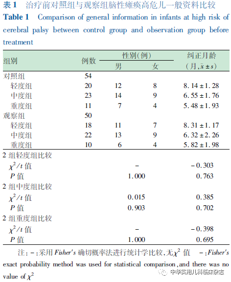 资料与方法1.1 研究对象 采用随机、单盲、对照试验方法。选取2017年11月至2019年11月青岛市妇女儿童医院康复科收治且符合纳入标准的脑瘫高危儿116例,采用随机数字表法分为对照组和观察组,每组58例。2组按照 Peabody 粗大运动发育商(GMQ),分为轻度组(80~89)、中度组(70~79)及重度组(35~69)。治疗期间对照组4例、观察组8例患儿因经济原因或出现发热、感染而退出本研究,最终对照组54例,观察组50例。2组患儿不同亚组之间性别、纠正月龄比较差异均无统计学意义(均P>0.05),具有可比性,见表1。本研究通过青岛市妇女儿童医院医学伦理委员会批准(批准文号:QFELL-KY-2022-26),并获得患儿监护人书面知情同意。
