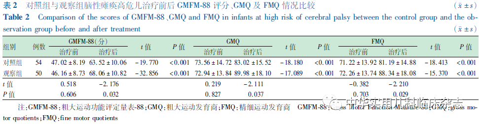 结果2.1 2组治疗前后粗大和精细运动功能的比较 治疗前2组患儿粗大运动功能(GMFM-88、GMQ)及精细运动功能(FMQ)评分比较差异均无统计学意义(均P>0.05);治疗后,2组患儿的粗大运动功能(GMFM-88、GMQ)及精细运动功能(FMQ)评分均较治疗前显著提高,差异均有统计学意义(均P<0.05),且观察组 GMFM-88、GMQ及FMQ评分均明显高于对照组,差异均有统计学意义(均P<0.05),见表2。