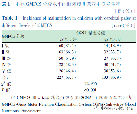 资料与方法1.1 研究对象 回顾性研究。选取2019年1月至10月在郑州大学第三附属医院儿童康复科住院治疗并应用“儿科营养管理”APP[包含改良儿科营养风险筛查工具(2021年修订版本)和儿科主观全面营养评估(Subjective Global Nutritional Assessment,SGNA)量表]录入完整信息的360例脑瘫患儿临床资料进行研究。入选标准:(1)符合2014年《中国脑性瘫痪康复指南》编写委员会制定的脑瘫诊断及分型标准[10];(2)年龄1~8岁。排除标准:未应用“儿科营养管理”APP录入相关信息或信息不完整者。本研究通过郑州大学第三附属医院医学伦理委员会批准[批准文号:(2019)医伦审第120号],本研究所有检查手段均为非侵入性检查方法,不影响临床治疗,所有患儿监护人均知情同意。1.2 方法 1.2.1 临床资料收集 收集脑瘫患儿人口学资料(性别、年龄)、脑瘫特征(分型、分级)。1.2.2 营养筛查 患儿家属签署知情同意书后,研究者在患儿入院24 h内依照改良儿科营养风险筛查工具的各项内容对入选患儿进行评分。现行改良儿科营养风险筛查工具由3个部分组成,包括疾病风险评分(单项指标有0和1分2种评分,目前对于脑瘫患儿,疾病风险评分赋值为1分)、近一个月来饮食摄入情况(有0、1、2分3种评分)、体格测量评分(有0、1、2、3分4种评分),总分0~6分。该筛查工具评分界值点为2分,即总分 0~1 分为无营养不良风险,总分≥2 分为存在营养不良风险。1.2.3 营养评估 应用SGNA量表进行评定。患儿入院24 h内,研究者首先使用该量表问卷获取患儿的营养相关病史,然后进行营养相关的体格检查,最终评定患儿的营养状态为良好或不良(包括中度营养不良和重度营养不良)。SGNA量表提供了一个全面的营养评估框架,包括营养相关病史(生长曲线、体重/身高比值、体重改变、进食频次、胃肠道症状、功能受损情况、代谢应激)和体格检查(皮下脂肪、肌肉消耗和水肿情况)[11-12]。1.2.4 粗大运动功能评定方法 由专业康复医师采用中文版粗大运动功能分级系统(Gross Motor Function Classification System,GMFCS)对脑瘫患儿粗大运动功能进行分级[13-14]。GMFCS根据患儿运动功能的表现分为5个级别,Ⅰ 级为最佳,Ⅴ 级为最差,级别越高,粗大运动功能能力越低。1.2.5 分组及疾病风险项评分赋值研究 现行改良儿科营养风险筛查工具中脑瘫作为疾病风险项评分赋值均为1分,本研究根据SGNA量表确诊患儿营养不良发生率和整体GMFCS分级的组间差异将脑瘫患儿分成不同亚组,将脑瘫疾病风险项评按不同亚组分别赋值0分或1分,从而组成不同的组合方案。然后,以SGNA量表结果作为参照标准,对包括现行方案在内的不同方案下改良儿科营养风险筛查工具的敏感度、特异度、约登指数进行比较,筛选出该筛查工具在不同 GMFCS 水平分级疾病风险项评分的合适赋值。1.2.6 研究质量控制 试验开始前对参与研究的营养师和营养医师相关人员进行严格培训,包括了解试验目的、掌握体格测量方法等。统一使用体格测量工具,< 2岁的患儿采用身长体重秤,≥2岁的患儿采用身高体重秤。如因合并关节挛缩、脊柱侧弯、不能负重等而无法直接测量身高的患儿,采用分段测量法估算身高,一般测量膝高(KH),估算公式为:身高=(2.69×KH cm)+24.7[7]。体重测量时着单衣,排空膀胱,精确至0.1 kg;身高测量时脱鞋,精确至 0.1 cm。< 2岁患儿的GMFCS分级评定由2名相关专业高级职称医师共同确定。为保证2个量表间结果的相互独立,2个量表评估分别由2名研究人员单独评定,并分别进行结果记录。1.3 统计学处理 采用SPSS 25.0统计学软件进行统计处理,采用Excel软件建立数据库。正态分布计量资料以x̄±s表示;计数资料用例(%)表示,组间比较采用χ2检验;效度评估比较采用敏感度、特异度、阳性预测值、阴性预测值、约登指数等指标;多重比较采用邦弗朗尼进行 Ⅰ 类错误校正;P<0.05为差异有统计学意义。