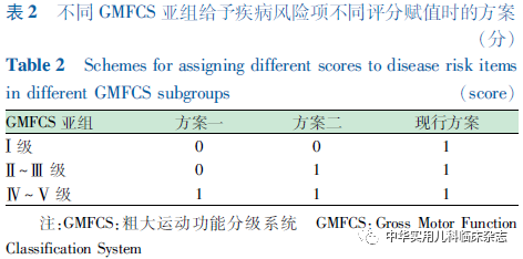 目的 探讨改良儿科营养风险筛查工具的疾病风险项在不同粗大运动功能分级(GMFCS)的脑性瘫痪(简称脑瘫)患儿中的合理赋值方案。方法 回顾性研究。收集2019年1月至10月在郑州大学第三附属医院儿童康复科住院的360例脑瘫患儿的临床资料,对所有符合入选标准的不同GMFCS分级水平的脑瘫患儿分别应用改良儿科营养风险筛查工具和主观全面营养评估(SGNA)量表进行营养筛查和评估,分析应用SGNA 量表评估的营养不良发生率在各GMFCS分级组间中的分布,组间比较采用χ2检验。根据组间统计学差异将各GMFCS分级脑瘫患儿分成不同亚组,对改良儿科营养风险筛查工具的疾病风险项评分分别赋值0分或1分,组成不同赋值方案。以SGNA量表评估结果作为参照标准,对上述不同赋值方案的营养风险筛查结果进行评价。结果 脑瘫患儿的营养不良风险检出率及营养不良发生率分别为58.1%(209/360)和36.9%(133/360)。营养不良发生率在GMFCS Ⅱ级和Ⅲ级,GMFCS Ⅳ级和Ⅴ级组间比较,差异均无统计学意义(均 P>0.05),据此将脑瘫患儿分成3个亚组(Ⅰ级组、Ⅱ~Ⅲ 级组和 Ⅳ~Ⅴ级组)。3个亚组疾病风险项予不同评分,组成3种赋值方案:方案一(3个亚组疾病风险评分分别为0分、0分、1分)、方案二(分别为0分、1分、1分)和现行方案(分别为1分、1分、1分)。以SGNA量表评估结果作为参照标准,3个方案的敏感度分别为85.7%、92.5%、93.2%,特异度分别为81.1%、78.0%、62.6%,约登指数分别为0.668、0.705、0.558,方案二的约登指数相对较高。结论 改良儿科营养风险筛查工具能有效筛查出脑瘫患儿营养不良风险,而GMFCS分级Ⅰ级和Ⅱ~Ⅴ级的患儿疾病风险项评分分别赋值为0分和1分的改进方案更为合理。
