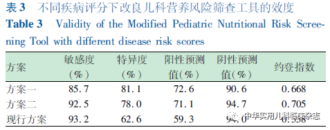 讨论营养筛查是指判断个体是否存在营养不良风险,以决定是否需要对其进行营养评定的一种筛查方法,对于早期及时和充分的营养支持至关重要[15]。目前国际上尚无针对儿科患儿的公认营养筛查工具,更无适合脑瘫儿童的筛查工具。国外对住院患儿营养筛查工具评估研究至今没有一项是根据中国儿童开发并完成验证的。2020年发表的《脑性瘫痪患儿营养支持专家共识》建议对脑瘫患儿入院24 h内进行营养筛查[7]。如何选择合理的营养筛查工具,快速有效地识别脑瘫患儿的营养不良风险,继而进行营养评估和干预,改善临床结局,是困扰儿童康复工作者的难题。改良儿科营养风险筛查工具作为一项适用于中国住院患儿的营养筛查评分工具,由上海交通大学医学院附属新华医院开发,已在国内数十家医院应用,进行过大样本和多中心的临床验证,证实了该筛查工具在儿科大多数住院患儿中应用的敏感性和准确性。李心仪等[16]通过对住院患儿大样本回顾性分析后认为,使用改良儿科营养风险筛查工具可规范儿科营养管理工作。然而,目前尚无该筛查工具在脑瘫患儿中的应用研究。近年来,开发者一直致力于该工具的优化,2021年对疾病风险部分进行了修订。本研究选择应用改良儿科营养风险筛查工具进行适用性探究,以期为国内脑瘫患儿的临床营养管理提供依据。对于存在营养不良风险的患儿,需行进一步营养评估。本研究在脑瘫患儿营养状况调查中使用SGNA量表来评估营养不良。营养评估尚无公认的金标准,SGNA 量表由加拿大多伦多大学Secker和Jeejeebhoy[11]于2007年首次报道,是一种经过验证的可预测住院患儿营养相关并发症和住院时间长短的营养评估工具[12]。近年来SGNA量表已被证明是一种可应用于脑瘫患儿的营养评估工具[17-18]。营养评估是多维的,没有单一的参数可以作为评估营养状况的综合指标。相较传统的体格测量评估,SGNA量表更为全面,为评估脑瘫患儿的营养不良提供了一个多维工具,并可对营养不良进行分度[19],但该评估方法耗时较长,不易在临床上对所有住院患儿推广应用。本研究分别应用改良儿科营养风险筛查工具和SGNA量表对脑瘫患儿进行营养风险筛查和营养评估,发现患儿存在较高的营养不良风险检出率(58.1%)和营养不良发生率(36.9%)。Mallawaarachchi 等[20]使用脑瘫生长图表对斯里兰卡科伦坡一家三级护理医院的104例脑瘫儿童进行横断面研究,结果显示其营养不良患儿占43%,本研究结果与之相近。本研究对脑瘫患儿营养不良发生率在GMFCS分级组间的差异进行了分析,发现其营养不良的发生率随GMFCS分级水平升高而升高,不同GMFCS分级水平间营养不良状况存在差异。因此,将不同等级的GMFCS水平分级分成了3个亚组。国内学者对西部地区2~8岁脑瘫患儿进行调查发现,其营养状况与GMFCS水平分级呈负相关[21]。Herrera-Anaya等[22]对177例脑瘫患儿营养状况调查研究也发现,随着脑瘫患儿GMFCS水平分级的升高,与营养相关的人体测量参数Z评分,如年龄别体重、年龄别身高等均逐渐降低。Leonard等[23]研究发现,与GMFCS Ⅱ~Ⅴ 组相比,GMFCS Ⅰ 组中的营养不良患病率明显较低。这些研究结论均与本研究结果相似。考虑其可能原因为脑瘫患儿的GMFCS分级越高,运动障碍越为严重,越易合并喂养困难、吞咽障碍、流涎、胃食管反流、不自主运动增多、肌肉痉挛等不良因素,这些因素导致患儿能量摄入减少、损失过多及消耗增加,从而易出现营养不良状况。目前,改良儿科营养风险筛查工具的开发者推荐将不同GMFCS分级水平的脑瘫疾病风险项评分均评为 1分,该界值的确定未充分考虑脑瘫疾病的异质性。本研究依据不同GMFCS分级水平对脑瘫疾病风险项评分给予不同赋值,共筛选出2种组合方案。以SGNA量表评估结果作为参照标准,对2种新方案及现行方案的筛查结果进行了效度的评估与比较,结果发现现行方案的敏感度最高,方案一的特异度最高(81.1%),方案二的约登指数最大(0.705)。在确定工具的总体有效性时,敏感度和阴性预测值较特异度和阳性预测值权重更大,尤其是筛查工具,因为该工具主要是识别营养风险,而不是直接诊断营养不良[24]。然而,作为营养筛查工具,较高敏感度可能会带来高假阳性结果,由于 GMFCS 分级较低的轻症脑瘫患儿在脑瘫患儿中占比较大,这些患儿营养状况往往受影响较小,疾病风险项评分1分将会出现较高的营养不良风险假阳性结果,这意味着对实际上无营养风险的患儿也要进行营养评估,增加了临床营养医师的工作量。本研究在选择不同脑瘫疾病评分的最优方案时,综合考虑了敏感度和特异度两项指标,又计算了它们的约登指数。结果方案二约登指数最大,并且其敏感度和特异度也相对较高,故该方案更符合作为营养筛查工具的要求。鉴于此,本研究建议 GMFCS Ⅰ 级和GMFCS Ⅱ~Ⅴ级脑瘫疾病风险评分赋值分别为0分与1分的方案为相对合理方案。不同于既往筛查量表的研究,本研究选用的改良儿科营养风险筛查工具是以我国住院患儿为研究对象的营养筛查工具,更适合我国的住院患儿和医疗环境,可有效解决我国脑瘫患儿的营养筛查问题。同时,在不同GMFCS分级水平的脑瘫患儿营养风险筛查时,应有针对性地对GMFCS分级水平较高的脑瘫患儿进行重点筛查。本研究作为目前脑瘫疾病营养风险筛查最大样本量的单中心研究,发现改良儿科营养风险筛查工具能有效筛查出