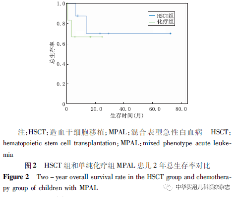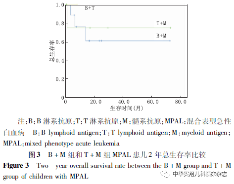 讨论根据WHO 2016造血和淋巴组织肿瘤诊断分类标准,MPAL是一种罕见的以免疫表型、染色体核型和分子生物学异常为特征的异质性白血病。由于MPAL的罕见性,其发病率尚不完全清楚,国外部分报道MPAL的发病率为0.2%~1.0%[7-8],而在天津某单中心报道中,儿童MPAL的发病率为1.2%[9]。根据文献报道,B+M表型的发生率高于T+M表型[2,10],本研究结果与之类似。Meta分析显示MPAL患者最常见的3个基因为BCR-ABL、ETV6-RUNX1和MLL[11]。本研究中也发现了类似的现象。1例患儿存在BCR-ABL融合基因阳性,1例MLL基因阳性。其次,有研究表明Ph阳性(BCR-ABL融合基因阳性)在男性MPAL中更为常见,并且在初次诊断时实验室检查常提示外周血中高白细胞计数[12]。Ph阳性患者的预后通常较差,尽管许多患者在初始诱导化疗中达到了CR,但其复发率非常高,复发后的CR率也很低,伊马替尼和异基因HSCT可以提高Ph阳性患者的生存率[12]。在本研究中,Ph阳性为1例13岁男性患儿(例1),初诊外周血白细胞计数 34.49×109/L,免疫表型为B+T淋系表达,初始诱导行VDLD方案及达沙替尼靶向治疗后NR,第2个疗程行CAM方案后第46天骨髓穿刺评估为CR,随访8个月未复发,为了尽可能提高长期生存率,后期拟行HSCT。由于患有这种罕见疾病的患者相对较少,因此很难统计MAPL患者基因突变的准确频率,尽管已有研究发现在MPAL中DNMT3A、TET2、RUNX1、WT1等基因突变[13-19],但目前对MPAL特有的细胞遗传学和分子生物学改变仍不清楚。在本研究中,1例患儿检测到NRAS、PAX5、IRF4、DNAH14、ECT2L基因突变,1例患儿检测到FLT3、PDGFRB、CBL基因突变,但随着近年NGS、转录组测序(RNA-seq)等技术的发展,更多遗传学及分子生物学异常将被发现。此外,目前尚无针对MPAL患者的统一性的化疗方案,国外对成人和儿童MPAL的诱导缓解化疗方案的系统综述显示,与更具有毒性的AML方案相比,ALL方案可获得更高的初始缓解率[11]。天津某单中心对29例MPAL患儿治疗结果分析发现ALL方案与联合方案第1个疗程CR率差异无统计学意义[9]。而在本研究中,第1个疗程缓解诱导化疗,10例(66.7%)采用ALL方案,1例(10%)CR,4例(26.7%)采用AML方案,3例(75%)达CR,可能与本研究分析的样本量较少有关。不仅如此,有关HSCT的问题仍存在争议,目前有研究表明,HSCT后的疗效明显优于单一的化疗(3年OS率为77%比16%)[20],在本研究中,在接受HSCT的8例患儿中,6例存活,在6例单纯化疗的患儿中,1例存活,4例失访,HSCT组和未行HSCT组2年OS率分别为(70.0±18.2)%、(66.7±19.2)%,差异无统计学意义,可能与样本量较少及患儿失访有关。在不同的研究中,儿童和成人的MPAL生存率差异很大(8.1%~60.0%)[2,10,21],韩国一项对于儿童MPAL的研究中显示,韩国MPAL患儿的5年OS率为(51.1±15.8)%[22-23],在天津某单中心研究中,5年OS率为(74±10)%[9],另一研究结果显示,MPAL患者的5年无事件生存(EFS)率低于ALL患者[(62±5)%比(80±1)%,P<0.001],但高于AML患者[(49±2)%,P=0.027][10]。一项Meta分析结果显示,虽然近年来MPAL的生存率有所提高,但预后仍较差,其原因可能是MPAL干细胞由于增生缓慢而具有耐药性,其白血病细胞可以通过改变表型来适应治疗,同时部分MPAL患者表达高水平的多耐药蛋白[8]。由于发病率低、随访时间短,选择HSCT患儿多,本研究中MPAL患儿2年OS率为(68.2±13.4)%。由于对MPAL发病机制和相关分子机制未研究明确,使得化疗方案的选择相当困难。综上所述,由于MPAL的罕见性,迫切需要对其发病机制和靶向化疗方案进行更深入的研究,结合大量病例进行多中心前瞻性研究,为MPAL的临床治疗提供崭新的依据和靶点,以提高MPAL患者的临床疗效。