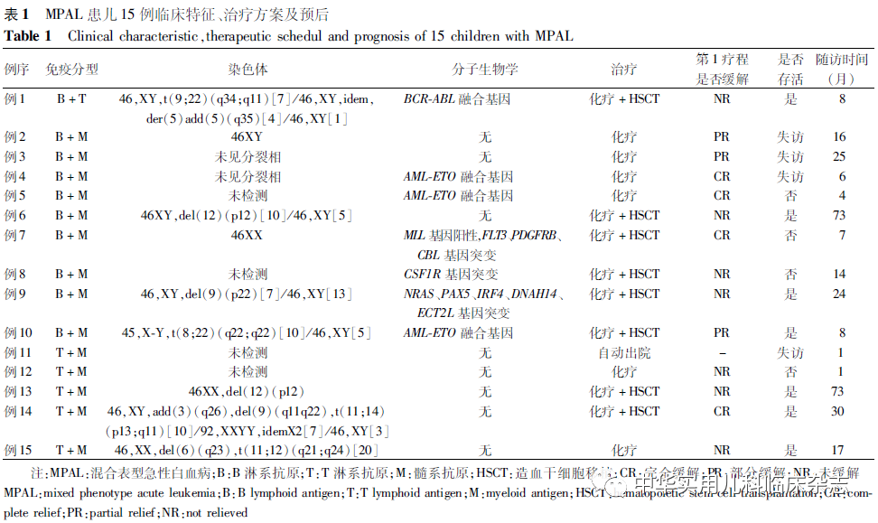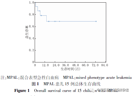 资料与方法1.1 一般资料 回顾性研究2012年1月至2020年12月苏州大学附属儿童医院收治的15例MPAL患儿的病例资料。本研究通过医院医学伦理委员会批准(批准文号:2021CS180),已获得“豁免知情同意”。1.2 MPAL诊断方法 白血病的诊断国际上通用细胞形态学(Morphology)、免疫学(Immunology)、细胞遗传学(Cytogenetics)和分子生物学(Molecular biology)分型,即MICM分型。对于混合型白血病,根据2016 年WHO 造血和淋巴组织肿瘤诊断标准[3]。1.2.1 细胞形态学 初诊患儿行骨髓穿刺采集骨髓液涂片,采用常规Wright-Giemsa染色,镜检观察细胞形态,按照英法美(FAB)标准分型。细胞化学染色主要包括:过氧化物酶染色(POX)、糖原染色(PAS)、非特异性酯酶染色(NSE)。1.2.2 免疫分型 使用流式细胞仪对各系相关的抗原进行检测,所需要的单克隆抗体主要包括:B淋系抗原:CD10、CD19、末端脱氧核苷酸转换酶(TdT)、cyu、分泌型免疫球蛋白M(sIgM)、CD20、cyCD79a;T系抗原:CD2、CD3、CD7、cyCD3;髓系抗原:CD11b、CD13、CD14、CD15、CD33、CD41、CD61、CD64、CD65、CD71、糖蛋白A(GPA)、胞质内髓过氧化物酶(cyMPO);干细胞相关抗原:CD34、CD45、CD117、人类白细胞抗原(HLA-DR)。胞膜标记抗原在白血病细胞中的表达率≥20%,则判断为阳性,而胞质标记抗原,如cyCD79a、cyMPO等,表达率≥10%,则判断为阳性[4]。1.2.3 细胞遗传学 骨髓染色体标本的制备采用短期培养法,显带分析应用改良的热变性姬姆萨R显带(RHG),平均每例患儿分析中期细胞数20个左右。染色体核型按照《人类细胞遗传学国际命名体制(ISCN)》[5]分析描述。1.2.4 分子生物学 可通过反转录-聚合酶链反应(RT-PCR)、荧光原位杂交技术(FISH)、二代测序技术(NGS)等方法检测分析。1.3 治疗方案 在本研究的15例患儿中,1例确诊后因个人原因放弃了治疗,14例接受了诱导化疗。10例患儿采用了急性淋巴细胞白血病(ALL)方案(长春新碱、柔红霉素、L-天冬酰胺酶联合地塞米松/泼尼松);1例BCA-ABL阳性联合使用达沙替尼靶向治疗;4例患儿采用了急性髓细胞性白血病(AML)方案,其中2例患儿采用了DAE方案(柔红霉素、阿糖胞苷联合依托泊苷),1例患儿采用了HAE方案(高三尖杉酯碱、阿糖胞苷联合多柔比星),1例患儿采用了HAG方案(高三尖杉酯碱、阿糖胞苷联合重组人粒细胞刺激因子)。在后续治疗中,1例患儿因化疗未缓解(NR)而放弃治疗,8例患儿在化疗缓解后接受了造血干细胞移植(HSCT),其余5例患儿仅进行了单纯化疗。1.4 疗效判断标准及随访 按照《血液病诊断及疗效标准》进行疗效评价[6],采用查阅病例或电话随访,随访至2020年12月31日。总生存(OS)率定义为从疾病确诊至死亡间隔时间或至末次随访时间。1.5 统计学处理 采用SPSS 23.0软件进行统计学分析。计数资料用例数(%)表示,组间比较采用χ2检验;符合正态分布的计量资料用x̄±s表示,非正态分布的计量资料用中位数(范围)表示,组间比较采用t检验或秩和检验。使用Kaplan-Meier(K-M)法估计生存率,比较应用 Log-rank 法。P<0.05为差异有统计学意义。