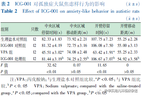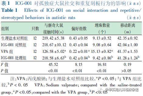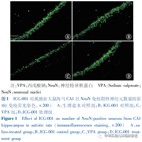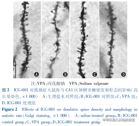 结果2.1 ICG-001对孤独症大鼠社交和重复刻板行为的影响 三箱社交实验检测结果表明,与生理盐水对照组相比,VPA组大鼠与新奇大鼠接触时间显著降低(P<0.05),ICG-001处理组与新奇大鼠接触时间增加(P<0.05),接近于生理盐水对照组水平(P>0.05)。与生理盐水对照组相比,VPA组大鼠偏好指数降低(P<0.05),ICG-001处理组偏好指数增加(P<0.05),接近于生理盐水对照组水平(P>0.05)(表1)。埋珠实验结果表明,与生理盐水对照组相比,VPA组埋珠数量显著增加(P<0.05),ICG-001处理组埋珠数量减少(P<0.05),接近于生理盐水对照组水平(P>0.05);VPA组与ICG-001处理组运动距离比较,差异无统计学意义(P>0.05)(表1)。