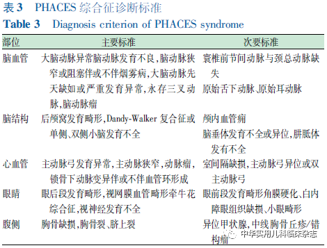 讨论PHACES综合征发病机制尚不清楚,尚无证据表明遗传异常与本病发生有关[11]。本病血管及器官异常多发生在身体同侧,血管生成发育的关键阶段为妊娠第3-12周,即由胚胎发育早期体细胞突变所致[11-12]。2009年经多学科联合(皮肤科、神经、肿瘤学、遗传学、心脏科、眼科) 共同确定了PHACES综合征诊断标准并于2016年修订(表3)。面部血管瘤>5 cm+1 个主要标准或2个次要标准为PHACES 综合征;面部血管瘤>5 cm+1 个次要标准,颈部或上部躯体血管瘤+1 个主要标准或 2 个次要标准,无血管瘤+2 个主要标准为疑似 PHACES 综合征。与 PAHCES 综合征相关的往往是大(直径>5 cm)或节段分布的面颈部IH。研究证实S1段、S4段血管瘤的脑部神经损伤风险较高, S3段血管瘤与心血管疾病及腹侧异常相关性更高[13]。IH是儿童最常见的良性肿瘤,发病率为5%~10%[14]。大部分IH仅小范围累及局部机体,呈良性生长,广泛和节段性分布的IH,尤其累及头、面颈部区域,应重点关注,以除外PHACES。