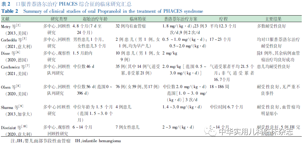 文献复习以检索式 (PHACE) OR (PHACES) AND (Propranolol)检索PubMed数据库,以“PHACES综合征”和“普萘洛尔”检索中国知网数据库和万方数据库,时间为1990年1月至2022年10月。共筛选出口服普萘洛尔治疗PHACES综合征的临床研究7篇,其中6篇回顾性研究,1篇观察性研究[2,5-10](表2)。总计165例PHACES综合征患儿接受口服普萘洛尔治疗,初治年龄0~360 d,药物剂量 0.5~3.0 mg/(kg·d),疗程18~186周。多数患者对口服普萘洛尔治疗耐受性良好。