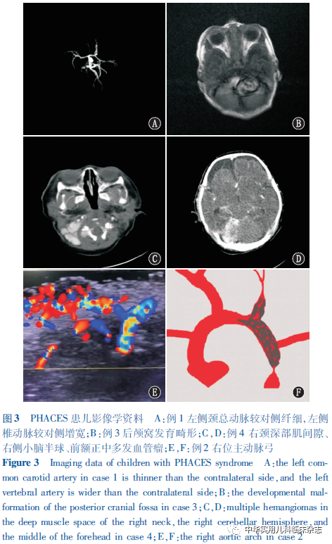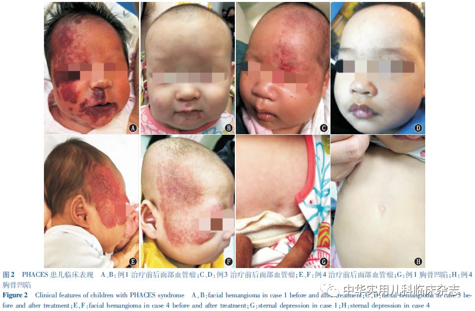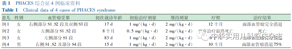 目前口服普萘洛尔为PHACES综合征一线治疗方案[15],多数患者耐受性良好。普萘洛尔治疗IH分子机制尚不清楚,研究揭示涉及的机制包括以下几个方面:周细胞调节血管收缩、抑制血管内皮细胞增殖、儿茶酚胺导致血管形成、负调节肾素-血管紧张素-醛固酮轴等。普萘洛尔在治疗婴幼儿血管瘤方面具有较好安全性及较少不良反应。本研究中4患儿未见普萘洛尔治疗的不良反应。口服普萘洛尔治疗婴幼儿最常见的不良反应为睡眠障碍、腹泻、四肢发冷、气道痉挛等,但这些不良反应通常是一过性的,可采取一定措施减少其发生,如最好在白天固定时间服药,然后立即进食。如上呼吸道感染合并支气管痉挛和食物摄入量减少,应停用普萘洛尔[8,16]。本研究结合病例及文献复习发现,口服普萘洛尔治疗PHACES 综合征影响疗效及预后有2个重要因素。(1)启动口服普萘洛尔治疗的时机。由于PHACES综合征的血管畸形在出生后数月内仍会持续进展[8],而患儿预后主要取决于大脑、主动脉、胸部、颈部等中等大小动脉受损程度[17]。因此口服普萘洛尔应该在发现病情后尽早启动。本研究例2患儿最终死亡,可能原因为严重心脑血管畸形,也可能与启动普萘洛尔治疗时机较晚导致心脑血管畸形持续加重有关。而例1、例3、例4因治疗介入早,虽也有合并心、脑血管结构的异常但预后均良好。(2)口服普萘洛尔的用量。作者认为普萘洛尔的使用应足程足量。既往研究证实,普萘洛尔治疗中高风险婴儿血管瘤的疗效及预后与药物剂量密切相关。同样,普萘洛尔治疗PHACES综合征如果药物剂量不足也可能影响疗效及预后,普萘洛尔的目标剂量应达到2~3 mg/(kg·d)[7,18]。目前普萘洛尔治疗PHACES综合征,特别是伴有动脉疾病风险者,剂量选择仍有争议[2]。有文献报道采用普萘洛尔治疗颅内血管瘤时可诱发低血压和脑血管灌注减少可能,并增加发生脑血管意外的风险[11,13]。然而,本研究及部分国外研究结果显示PHACES综合征,即使是有高卒中风险患儿,对口服普萘洛尔治疗耐受性良好[8,16]。可先小剂量启动治疗,更慢增加至目标剂量。另外需要更频繁地监测血压。一般第1周的初始剂量为0.5~1.0 mg/(kg·d),逐渐增加至2~3 mg/(kg·d),尽量每天分3次给药,以最大限度地降低血压峰值水平的波动[2,5,7,18]。当IH发生在面部且是节段性或面积较大(直径>5 cm),发生PHACES 综合征可能性为 20%~31%。在一项评估 108例患有大节段性面部IH研究中,诊断为 PHACES 综合征者约1/3[19]。此外,最常见的外部受累为大脑结构和血管。因此,在考虑PHACES综合征时,要积极进行神经和心血管系统评估,包括超声心动图、心脏及脑血管影像学检查,以更好地检查心脏和头臂解剖结构[16,20],此外,还应包括对眼和胸骨中线异常的评估。PHACES综合征患者随年龄增大还可能出现新的合并症,包括头痛、内分泌、听力和牙齿异常等,累及气道的血管瘤可能引起呼吸困难[7,21],需联合耳鼻喉科进行评估,本研究例1患儿因口周血管瘤首诊耳鼻喉科。因此,各科医师在门诊遇到面部IH可疑PAHCES综合征的患儿,一定注意仔细甄别,尽早明确诊断及启动多学科会诊及治疗,多学科会诊可及时识别可能的中枢神经系统、心脏、眼部、内分泌、听觉、语言和吞咽异常,从而实施有效干预措施,预防并发症。本研究为单中心回顾性研究,样本量偏少,且随访时间尚短,存在一定局限性。另外本研究对受累系统的随访深度不够,缺少对患儿生长发育、生活质量的评估。上述不足可通过前瞻性研究、多中心合作、扩大样本量进一步多角度对患者临床资料进行分析来完善、提高。