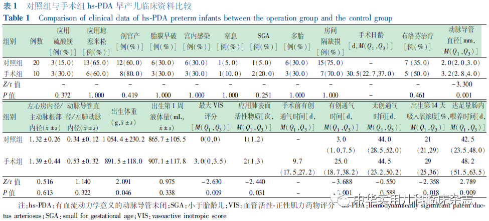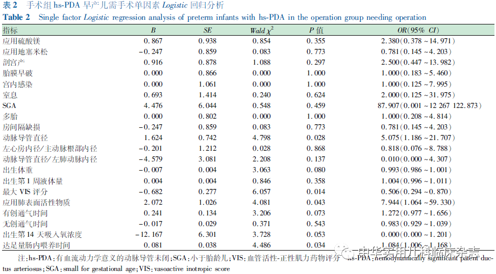 资料与方法1.1 研究对象 应用巢式病例对照研究方法,回顾性分析北京协和医院新生儿重症监护病房2007年1月至2020年5月收治的胎龄<30周且诊断为hs-PDA的早产儿病例资料。入选标准:(1)出生胎龄<30周且体重<1 500 g;(2)患儿诊断为hs-PDA。排除标准:(1)重大先天性畸形;(2)先天性代谢缺陷,染色体疾病;(3)死亡或放弃治疗;(4)病历资料不完整。本研究通过北京协和医院医学伦理委员会批准(批准文号:I-22PJ1003),患儿监护人均知情同意。1.2 方法 收集孕母孕期资料,包括:孕母分娩方式、有无胎膜早破、产前使用地塞米松(分娩前1个月内)及硫酸镁应用情况。收集早产儿临床资料,包括:(1)出生情况,包括出生体重、分娩方式、是否为小于胎龄儿(small for gestational age,SGA)、是否为多胎以及出生后窒息情况;(2)住院期间循环情况,包括动脉导管直径、房间隔缺损直径、左心房内径与主动脉根部内径比值、动脉导管直径与左肺动脉内径比值。手术前最大血管活性-正性肌力药物评分(vasoactive inotropic score,VIS)评分;(3)住院期间呼吸情况,包括应用肺表面活性物质次数、有创通气时间、无创通气时间、出生第14 天吸入氧浓度;(4)住院期间营养情况,包括出生第1周液体量,达足量肠内喂养时间。行手术治疗的hs-PDA病例为手术组。按1∶2的比例,在入选的hs-PDA病例中匹配对照组,匹配条件包括相同性别及出生胎龄±7 d。hs-PDA诊断标准[3]:(1)心脏超声检查明确存在左向右分流(或双向双期分流);(2)左心房与主动脉根部比值>1.3;(3)导管直径>1.5 mm;(4)还包括以下临床征象之一:心脏杂音、水冲脉、心动过速、心前区搏动增强、脉压差增大、呼吸情况恶化。达足量肠内营养时间定义[4]:肠内喂养量达150 mL/(kg·d)的日龄。SGA为出生体重小于相应胎龄新生儿体重的第10百分位,不同胎龄早产儿生长指标评价参考2013版Feton曲线[5]。VIS评分计算公式[6] :VIS=多巴胺剂量[μg/(kg·min)]+多巴酚丁胺剂量[μg/(kg·min)]+10×米力农剂量[μg/(kg·min)]+100×肾上腺素剂量 [μg/(kg·min)]+100×去甲肾上腺素剂量[μg/(kg·min)]+10 000×血管加压素剂量[U/(kg·min)]。手术指征:对于持续存在、有血流动力学意义、临床症状明显,支持疗法失败或不宜口服布洛芬治疗及布洛芬治疗失败的患儿采取手术治疗。1.3 统计学处理 应用SPSS 26.0统计学软件对数据进行统计分析。计量资料经正态性检验,符合正态分布的计量资料采用x̄±s表示,组间比较采用独立样本t检验。非正态分布的计量资料采用M(Q1,Q3)表示,组间比较采用Mann-Whitney U检验。分类计数资料采用例数(%)表示,组间比较采用Fisher′s确切概率法检验。采用条件Logistic回归分析筛选hs-PDA患儿需手术治疗的相关因素。P<0.05为差异有统计学意义。