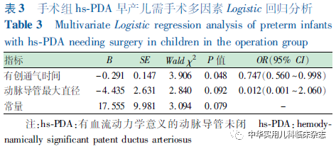 讨论PDA为早产儿最常见的心血管系统疾病,胎龄越小发生率越高,出生胎龄小于28周的早产儿中PDA发生率高达70%[7]。持续开放的动脉导管会导致血液从主动脉向肺动脉干分流,从而引起循环血流动力学相关改变:由于肺中血液过多而引起肺充血、肺水肿甚至严重呼吸衰竭;体循环相对缺血,心输出量代偿性增加;重要脏器血供再分布,肠、肾等脏器相对缺血,最终导致早产儿支气管肺发育不良、心力衰竭、新生儿坏死性小肠结肠炎、早产儿脑室内出血等并发症。其治疗方案需通过综合胎龄、临床表现、对血流动力学的影响及心脏超声相关数据制定[8-10]。对于hs-PDA持续存在的有症状患儿,治疗方法包括应用环氧合酶抑制剂,如吲哚美辛、布洛芬等,以及手术结扎治疗。手术结扎可达到完全、迅速闭锁动脉导管的目的,但由于其为有创操作,且因术后心肺生理改变较大,存在发生诸多术后并发症的风险,如血压波动、呼吸功能损害、感染、脑室出血、乳糜胸、喉返神经麻痹等[11]。随着床旁及微创外科手术的发展与成熟,有研究将动脉导管内径平方与体重比值、脑钠肽数值及心脏超声左心房直径与主动脉根部比值等作为hs-PDA是否需要手术结扎的参考标准[12-14]。一项欧洲大样本PDA手术患儿临床特征的统计研究显示,欧洲各地区实施手术日龄差异巨大,对于手术治疗较为积极的地区,首次手术的平均日龄为5 d,而相对保守地区则为18.5~27.0 d[15]。本研究中手术组的手术日龄为30.5 d,较为保守。本研究匹配胎龄和性别后,手术组患儿出生体重明显低于对照组,这与美国新生儿研究网络通用数据库回顾性研究相一致,即需手术治疗PDA的早产儿具有出生胎龄及出生体重更小的特征[10]。其原因是由于出生体重越低的早产儿动脉导管平滑肌发育越不成熟,对于低氧血症以及前列腺素对动脉导管的松弛作用敏感性越高,故越易出现动脉导管闭合延迟及hs-PDA,且对于药物治疗效果不佳。本研究2组数据对比结果提示,手术组患儿动脉导管内径大于对照组,达到全肠内营养时间较长,最大VIS评分较高,且单因素Logistic条件回归中提示与hs-PDA需手术治疗相关。分析其原因在于,由于动脉导管内径与分流量大小相关,导管内径越大,血液经动脉导管从主动脉向肺动脉干分流量越大,故中度及大型导管盗血会导致PDA患儿重要器官的氧供及血流灌注减少,需较大剂量血管活性药物维持血压及体循环灌注,而在肠道则表现为肠系膜缺血、缺氧性坏死,导致喂养不耐受,进而使达足量肠内喂养时间延长。本研究结果提示,手术组患儿肺表面活性物质应用次数多于对照组,且单因素Logistic条件回归中提示与hs-PDA需手术治疗相关。该结果一方面提示手术组患儿新生儿呼吸窘迫综合征(neonatal respiratory distress syndrome,NRDS)病情较重,而NRDS导致hs-PDA发生主要与低氧血症有关。低氧血症可抑制平滑肌细胞膜去极化所致的细胞钙离子内流,改变肺血管正常重构,增加肺血管阻力,导致炎症肺动脉高压形成,并影响动脉导管平滑肌的收缩,使动脉导管保持开放。另一方面持续开放的动脉导管可增加肺血流,从而导致左心房压力负荷增加以及肺静脉压力增加,使肺液滤过进入肺间质增加,进一步加重患儿呼吸窘迫,导致临床上需多次应用肺表面活性物质。故NRDS病情较严重、需多次应用肺表面活性物质的hs-PDA早产儿更可能需手术治疗。本研究2组数据对比结果提示,手术组患儿出生第14 天吸入氧浓度高于对照组,且单因素Logistic条件回归中提示与hs-PDA需手术治疗相关,而多因素Logistic 条件回归结果提示有创通气时间为PDA早产儿需手术治疗的独立危险因素。这也与一些回顾性队列研究的结论类似[16-18]。由于极低出生体重儿肺泡及肺间质毛细血管发育不成熟,气体交换表面积小,肺血管系统对缺氧和血管扩张剂反应差,当伴hs-PDA时,经导管向肺血管分流的血流量较大,当肺血流量超过左心室容量时,肺血管不能有效收缩,从而导致肺循环血流量超负荷,肺间质及肺泡水肿,出现气体弥散受限以及肺顺应性降低。此外超低出生体重儿肺淋巴回流机制不完善,清除肺液能力极差,导致液体潴留在组织间隙,以上机制可共同导致机械通气时间延长,吸入氧需求增加。同时机械通气使炎性介质分泌增加,抑制了新生血管的生长,导致肺泡发育简单化,加重肺水肿,两方面因素相互作用,最终导致患儿在病程中所需呼吸支持条件更高,且总有创通气时间更长[19-20]。有学者尝试将各项心脏超声指标、实验室检查及临床表现综合应用于hs-PDA的诊断及严重程度评估[21-22]。而本研究由结果出发,通过回顾性巢式病例对照研究,进一步探索已行手术hs-PDA患儿的临床特点,并总结其与手术结局的相关性,并由此得到hs-PDA需手术治疗的危险因素。研究结果提示,对于存在直径>3.2 mm的动脉导管,肺表面活性物质应用多于2次,有创通气时间>25 d,出生第14 天吸入氧浓度仍持续高于29%的患儿,当其出现喂养困难、呼吸支持条件增加时,更需考虑积极行PDA的手术治疗。本研究为单中心回顾性巢式病例对照研究,纳入分析的影响因素较多,而样本量较小,存在病例数少、混杂因素较难避免等不足,因此,如何综合hs-PDA需手术治疗的多种高危因素确定手术治疗的适宜指征和时机还需行大样本、多中心、前瞻性临床研究进一步验证。此外,由于本研究时间跨度较大,无法将超声左室舒张末期内径Z值指