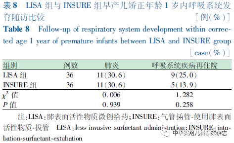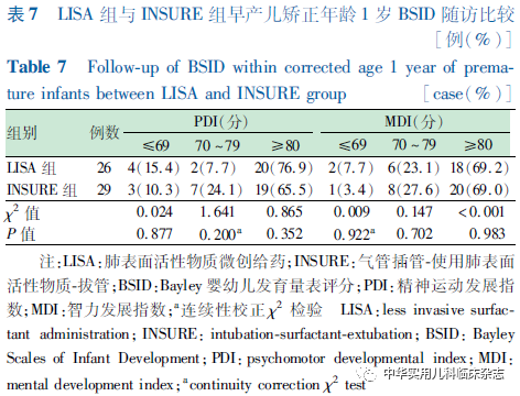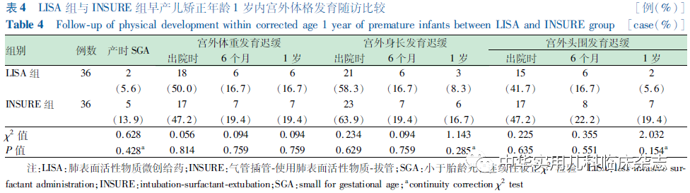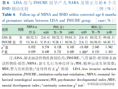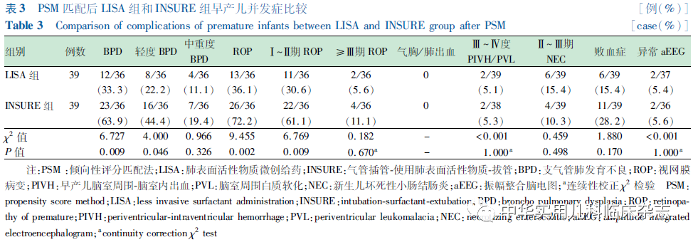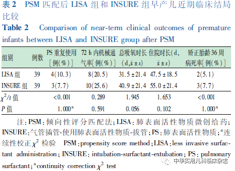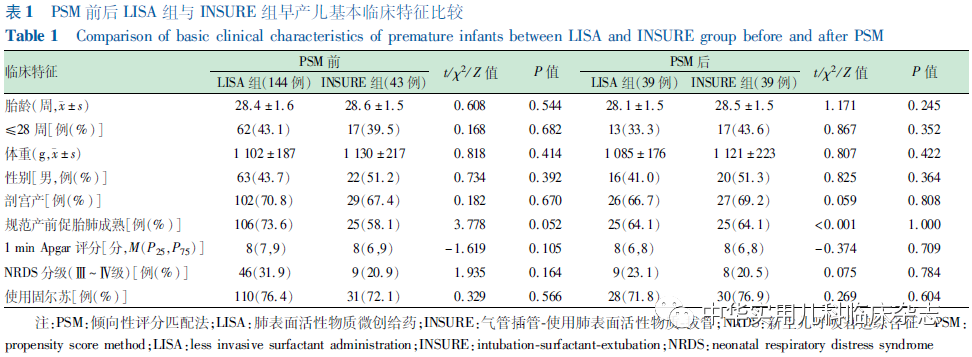 资料与方法1.1 一般资料 对重庆医科大学附属妇女儿童医院新生儿科2019年3月至2021年2月收治的符合纳入标准的早产儿进行回顾性研究,使用LISA注入PS的纳入LISA组,使用INSURE注入PS的纳入INSURE组。本研究通过医院医学伦理委员会批准[批准文号:2021伦审(科)001号],病历资料查阅及随访情况均经监护人知情同意。1.1.1 纳入标准 (1)胎龄24~31+6周;(2)出生体重<1 500 g;(3)出生后进行性呼吸困难,确诊NRDS[2];(4)出生后产房及转运至NICU过程中持续无创辅助呼吸(转运呼吸机:瑞士,Bonaduz,HAMILTON-C1);(5)出生后6 h内无创辅助呼吸呼气末正压(PEEP)6~8 cmH2O(1 cmH2O=0.098 kPa),吸入氧体积分数(FiO2)≥30%,需PS治疗。1.1.2 排除标准 (1)PS前接受气管插管治疗或存在气管插管治疗指征;(2)重度窒息患儿;(3)首次PS应用大于出生后6 h;(4)先天性重症肺部和全身感染疾病;(5)存在影响呼吸功能或呼吸道结构异常可能影响研究结果的先天畸形、发育异常或遗传代谢性疾病(完全性腭裂、先天性膈疝、复杂性先天性心脏病、先天性中枢低通气综合征、重症肌无力、Pierre-Robin综合征、先天性喉软化、鼻后孔闭锁、严重颜面部损伤等)。1.2 治疗方法 LISA组:按无菌操作要求,直视喉镜下暴露声门,抬高床头,使用LISA管(无锡市九龙医疗器械有限公司,CRPS-101)2~3 min滴入PS(珂立苏,华润双鹤药业股份有限公司,国药准字H20052128,100 mg/kg或固尔苏,意大利凯西制药公司,进口药品注册证号:H20181201/2,200 mg/kg),观察患儿呼吸,必要时采用按摩手足心或托背方式刺激患儿保持一定频率自主呼吸,操作过程中持续CPAP。INSURE组:按无菌操作要求,直视喉镜下暴露声门,抬高床头,气管插管接T组合或有呼气末正压通气的新生儿复苏囊,2~3 min滴入PS,操作过程中暂停无创辅助呼吸。1.3 近期住院观察指标及诊断标准 根据出生后住院期间电子病历资料收集患儿数据。(1)基本临床特征,包括胎龄、体重、性别、生产方式、产前促胎肺成熟、1 min Apgar评分、NRDS分级、PS种类;(2)近期临床结局及并发症,包括PS重复使用、72 h内机械通气率、总吸氧时长、住院时长、矫正胎龄36周病死率、气胸/肺出血、支气管肺发育不良(BPD)、早产儿脑室周围-脑室内出血(PIVH)/脑室周围白质软化(PVL)、新生儿坏死性小肠结肠炎(NEC)、视网膜病变(ROP)、败血症、异常振幅整合脑电图(aEEG)。其中,重庆医科大学附属妇女儿童医院早期早产儿出院标准为纠正胎龄≥34周,体重≥1 800 g,不需要吸氧,能够经口完成奶量>150 mL/(kg·d);(3)BPD诊断:依据2001年美国国立儿童健康和人类发展研究所发布的标准[7],即出生后持续用氧超过28 d则诊断为BPD。根据矫正胎龄36周时不吸氧、FiO2<30%、FiO2>30%或需要机械通气,定义为轻度、中度和重度 BPD;(4)PIVH/PVL、NEC、ROP、败血症诊断标准均参照第5版《实用新生儿学》[2]。1.4 出院后随访观察指标及诊断标准 出院后矫正年龄1岁内随访资料:(1)宫外体格发育评估:记录出院时、矫正月龄6个月、矫正年龄1岁时患儿的体重、身长、头围数据。矫正胎龄40周以内使用2013年修订后的Fenton早产儿生长曲线进行体格发育评价[8];矫正胎龄40周后使用2006年世界卫生组织(WHO)儿童生长标准化曲线进行评价。体重、身长、头围位于同龄同性别体重、身长、头围第10百分位数以下记为宫外生长发育迟缓。(2)听力评估:矫正胎龄34周行自动听性脑干反应(AABR)初筛,矫正胎龄40~42周复查AABR,矫正月龄6个月行诊断性听力检查。单耳或双耳未通过记为异常。(3)视力评估:住院期间矫正胎龄31~32周后视病情行眼底检查,行ROP初筛,必要时依据中国医师协会新生儿科医师分会发布的《早产儿治疗用氧和视网膜病变防治指南》(修订版)[9]行干预治疗。矫正月龄6个月ROP复查,矫正年龄1岁行视力检查。(4)神经系统评估:矫正胎龄满40周行新生儿行为神经评分(NBNA),≤35分记为异常。矫正月龄6个月及矫正年龄1岁时由专职持证人员采用标准化的中国城市修订版 Bayley 婴幼儿发展量表(BSID)进行神经发育评估。根据该量表评分标准,精神运动发展指数(PDI) ≥ 80分和智力发展指数(MDI)≥80分为神经发育正常,PDI或MDI ≤ 69 分为发育迟缓,70~79 分为临界。(5)呼吸系统评估:矫正年龄1岁内患儿肺炎、呼吸道疾病再住院发生率。1.5 统计学处理 应用SPSS 22.0统计软件+R软件包进行数据分析。将对比组间的基本信息采用PSM进行矫正,设置匹配度为1∶1,卡钳值取0.02。对连续变量进行正态分布检验(Shapiro-Wilk检验),符合正态分布的连续变量以x̄±s表示,组间比较采用独立样本t检验;对不符合正态分布的连续变量采用中位数(M)(P25,P75)描述,非参数检验(Mann-Whitney检验)对组间差异进行检验。分类变量采用例数(%)表述,对存在缺失值的用例数/剔除缺失值后数量(%)表示;组间比较采用 χ2检验,如预期计数低于5例,应用连续性校正χ2检验。P<0.05为差异有统计学意义。