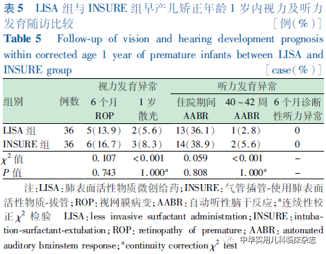 讨论早产儿组织器官发育不成熟,尤其是极早产儿和超早产儿对外界适应能力差,易出现各种并发症。如何早期强化临床管理,进一步提高早产儿存活率,减少并发症,改善存活者预后是新生儿工作者努力的方向。近年来,微创注入PS的LISA技术因其对肺部损伤较小,可能减轻肺部的近远期病变[10-11],受到学界和临床工作者越来越多的关注。英国144家新生儿重症监护室调查中只有11%的单位在使用 LISA 技术,但大多数(78%)会考虑在自己医院使用 LISA 技术[12]。LISA技术在我国应用时间较短、范围较小,相关研究报道有逐渐增加的趋势,但研究结果不尽相同,且研究大都集中在近期临床结局,对远期预后的研究极少[13-14]。本研究发现LISA技术较INSURE技术可降低BPD的发生率。BPD本质上是在遗传易感性的基础上,氧中毒、气压伤或容量伤以及感染或炎症等各种不利因素对发育不成熟肺的损伤,以及损伤后肺组织异常修复[2]。动物实验和临床研究中均有证据表明出生后即便短时间的高吸气峰压也会导致肺损伤,进而发展为BPD[15-17]。而LISA技术在应用过程中提供稳定持续PEEP,用细管给药,避免高吸气峰压,可减少气压伤或容量伤,对肺部的损伤较小,笔者认为这是LISA较INSUIRE 技术能明显降低BPD发生率的主要原理。但目前国内外实证研究结论存在分歧,如王伏东等[18]认为LISA组与INSURE组患儿BPD发生率无差异,同期刘慧强等[14]的研究认为LISA技术较INSURE技术可降低BPD的发生率。王伏东等[18]研究中2组患儿胎龄均值分别为31.6周、31.8周,出生体重均值分别为1 876 g、1 956 g,刘慧强等[14]的研究中2组患儿胎龄均值分别为29.5周、29.6周,出生体重均值分别为1 285 g、1 255 g,研究样本的胎龄体重差异较大。本研究纳入2组患儿与刘慧强等[14]的研究胎龄体重更接近,结论也一致。Kribs等[16]的研究样本胎龄更小,其证实在24~26周超早产儿中 LISA技术可降低BPD发生率。因此笔者认为LISA对治疗胎龄较小、出生体重较低的早产NRDS更具优势。本研究对LISA和INSURE技术影响BPD发生率进行分度对比,发现轻度BPD组间差异有统计学意义,而中重度BPD差异无统计学意义。推测LISA技术可减少气压伤或容量伤,对肺部的损伤较小,因此可有效降低轻度BPD发生,而中重度BPD的发生更多的是因为患儿体质、宫内发育、遗传易感性、长期持续机械通气等自身或其他因素,LISA技术虽可发挥一定优势,但效果并不明显。本研究结果显示LISA技术较INSURE技术可降低ROP发生率,其中 Ⅰ~Ⅱ 期ROP的发生率差异有统计学意义,≥Ⅲ 期ROP差异无统计学意义。德国新生儿网络的一项大型队列研究通过对7 533 例胎龄为22~28+6周的极低出生体重儿进行观察,结果发现与 INSURE 技术相比,LISA 技术能降低患儿ROP 的发生率[19]。Aldana-Aguirre等[20]的Meta分析结果显示,LISA 技术和INSURE技术在出生胎龄<32周早产儿≥Ⅲ 期ROP发病率差异无统计学意义。分析原因可能为LISA技术可降低BPD发生率,进而减少早产儿氧暴露,最终降低了ROP发生率。但ROP发病影响因素很多,LISA 技术减少氧暴露因素仅占一部分,早产、低体重、基因、种族、感染等因素仍未消除,最终致使≥Ⅲ 期ROP的发生率无差异。出院后矫正年龄1岁内的患儿随访资料结果显示,2组患儿体格发育、视听及神经系统发育、呼吸系统发育情况差异均无统计学意义,与Herting等[21]和Márquez Isidro等[22]的结论相符。但同年龄2组数据横向比较LISA组不良预后一定程度上低于INSURE,随着年龄增长,2组不良预后发生率均呈下降趋势,分析原因可能为随着患儿年龄的增长,其体格、视听、神经系统、呼吸系统发育不断健全,LISA技术较INSUE技术在患儿预后的优势逐步缩小。本研究采用PSM对研究数据进行筛选,尽量减少数据偏倚的影响,具有较高的可信度。但仍应注意到,匹配后病例数偏少,系单中心研究,在评价相关指标时证据力度相对不足。今后仍需要大样本多中心临床进一步研究。综上所述,采用LISA技术进行PS治疗能够降低轻度BPD和 Ⅰ~Ⅱ 期ROP发生率,尤其是对胎龄较小、出生体重较低的患儿效果更优。LISA技术不会增加其他并发症风险,其预后效果与INSURE相当,应用价值值得期待。