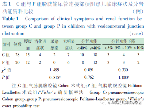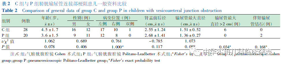 资料与方法1.1 一般资料 回顾性研究。选取安徽省儿童医院泌尿外科2017年1月至2021年12月收治的48例VUJO患儿病例资料,按时间先后分为气膀胱腹腔镜Cohen术式组(C组)(28例)和气膀胱腹腔镜Politano-Leadbetter术式组(P组)(20例)。VUJO患儿入选标准:出现临床症状如腰腹部疼痛、恶心、呕吐、尿路感染、血尿、合并肾输尿管结石等临床症状,影像学检查提示肾积水伴输尿管进行性扩张;或临床症状不明显但肾核素扫描提示肾功能<40%或随访过程中分肾功能下降(表1)。2组间输尿管最大直径>2 cm患儿例数比较,差异有统计学意义(P=0.034)(表2)。本研究通过医院医学伦理委员会批准(批准文号:MR-34-21-010291),监护人均知情同意。