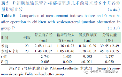 目的 比较气膀胱腹腔镜Cohen术与Politano-Leadbetter术治疗儿童膀胱输尿管连接部梗阻(VUJO)的手术疗效。方法 回顾性研究。收集2017年1月至2021年12月安徽省儿童医院泌尿外科行手术治疗的48例VUJO患儿病例资料,按时间先后分为气膀胱腹腔镜Cohen术式组(C组)(28例)和气膀胱腹腔镜Politano-Leadbetter术式组(P组)(20例)。比较2组患儿手术时间、术后保留导尿管时间、血尿时间、住院时间及手术前后肾积水、输尿管扩张、肾功能改善情况等相关资料。计数资料采用χ2检验或Fisher′s确切概率法比较,计量资料采用t检验比较。结果 48例患儿均由同一手术医师顺利完成手术,无中转开放手术,C组6例巨输尿管患儿行输尿管裁剪,P组2例肾盏输尿管结石患儿术后无残留。C组与P组手术时间比较[(136.5±35.4) min 比(165.8±33.2) min],差异有统计学意义(t=-3.154,P=0.002)。术后随访(10.3±2.6)个月,C组和P组术后2个月内分别有8例、6例出现尿路感染,均予抗感染保守治疗后好转,拔除D-J管后感染控制,术后6个月复查静脉肾盂造影显示输尿管走行通畅。C组术后6个月复查超声肾盂前后径较术前明显减小[(1.62±0.54) cm 比(2.55±1.24) cm,t=-5.027,P=0.001];输尿管最大直径较术前明显减小[(0.95±0.27) cm 比(1.51±0.52) cm,t=-8.495,P<0.001];肾皮质厚度较术前明显增加[(1.47±0.25) cm 比(0.86±0.46) cm,t=2.028,P=0.004];利尿肾图显示分肾功能较术前明显提高[(46.27±2.16)% 比(41.83±3.04)%,t=1.647,P=0.030]。P组术后6个月复查超声肾盂前后径较术前明显较小[(1.48±0.82) cm 比(2.68±1.41) cm,t=-2.740,P=0.003];输尿管最大直径较术前明显减小[(1.05±0.46) cm 比(1.36±0.27) cm,t=-1.635,P=0.040];肾皮质厚度较术前增加[(1.38±0.33) cm 比(0.74±0.39) cm,t=9.073,P<0.001];利尿肾图显示分肾功能较术前明显提高[(45.18±3.35)% 比(39.55±2.49)%,t=1.277,P=0.030]。Politano-Leadbetter术较Cohen术后肾盂前后径恢复更好[(1.48±0.82) cm 比(1.62±0.54) cm,t=-1.748,P=0.030]。结论 气膀胱腹腔镜Politano-Leadbetter术建立了较长的黏膜下隧道,不改变输尿管走形及开口位置,治疗VUJO合并肾盏、输尿管结石效果确切,术后肾积水恢复较Cohen术更好,但手术难度大、时间长,手术医师可根据自身经验选择合理术式。