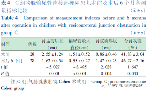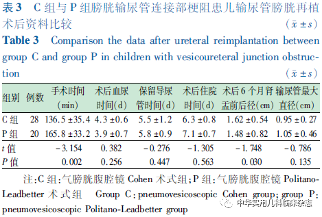 结果2.1 一般资料 48例患儿均由同一手术医师顺利完成手术,无中转开放手术, C组6例输尿管直径>2 cm的患儿术中行输尿管裁剪;P组2例患儿合并肾盏输尿管结石术中取石且术后无残留;2组手术时间比较差异有统计学意义(P=0.002);2组术后血尿时间、保留导尿管时间、术后住院时间比较,差异均无统计学意义(均P>0.05)(表3)。