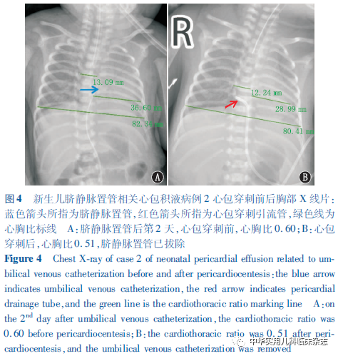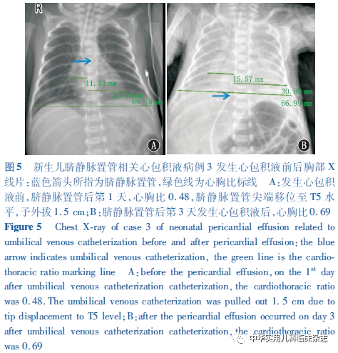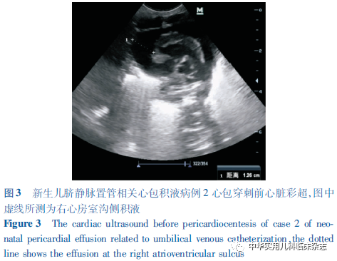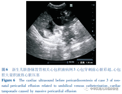 讨论UVC自20世纪40年代末被首次描述以来[3],已成为国内外NICU救治早产儿及危重足月儿的常用技术。UVC具有操作简单易行、可迅速建立静脉通路、留置时间长等优点,并可减少患儿反复穿刺的痛苦并降低外周静脉穿刺发生输液外渗等风险,适用于临床输液、换血、监测中心静脉压等。然而,作为CVC的一种,UVC也不可避免地存在CVC所共有的并发症,如导管相关血流感染、出血、导管阻塞、血栓、空气栓塞、心律失常、心包和胸腔积液、心包压塞、导管移位及断裂、血管壁穿孔等[1,4]。此外,由于置管穿刺部位特殊,UVC还会引起其特有的并发症,如坏死性小肠结肠炎、肝脓肿、肝损害等消化系统并发症[5]。在CVC相关的诸多并发症中,心包积液和心包压塞相对罕见,发生率为0.07%~3.00%[6],但心包积液发生后可导致心包腔压力骤升、心脏舒张功能受限、心排血量减低,引起血流动力学紊乱,若未及时、准确地予以诊断与处理,病死率极高。据报道,CVC相关心包积液发生后,行心包穿刺的患儿病死率为8%,未行心包穿刺的患儿病死率高达75%[6]。CVC导致心包积液的原因目前尚无定论,但导管位置不当被认为是心包积液的主要风险因素[4],尤其是导管尖端深入右心房或与之成角度时[7]。UVC在正确置入后出现移位的可能原因包括:新生儿出生后早期生理性体重下降导致腹围减小、新生儿脐根部结痂干化以及抱起测量或更换尿布等护理操作导致新生儿腹部及下肢体位变换等。置管早期当导管位置移动时可由于导管过深的直接机械损伤致心肌穿孔;然而更多情况是导管置入数天后,管端与血管和心肌壁反复或连续接触磨损导致内皮损伤进而造成心肌穿孔;此外,输注高渗肠外营养液还可引起心内膜的渗透性损伤使液体弥散导致心包积液[6]。本研究报道的3例患儿均为早产儿,与既往报道相似[8-9],提示早产及低出生体重儿更易发生心包积液,病理机制可能与早产儿心脏组织薄软、发育不成熟相关。发生心包压塞时,前2例患儿UVC尖端位置均较置管时上移2~3个胸椎水平,病例3虽位于正确位置,但置管后曾因导管尖端位置上移而外拔1.5 cm,均提示心包积液发生与导管位置过深有关。因此,UVC置入前,应进行置管深度的预估;UVC置入后,应尽量避免可使患儿躯干大幅度移动进而造成导管移位的护理操作,且应定期监测导管位置,以任何原因进行胸部、心脏影像学检查时均应注意管端位置及心脏形态变化,以便及时发现并纠正导管移位,减少相关并发症的发生[9-10]。CVC相关心包积液起病早期未对心脏血流动力学形成明显影响(即发生心包压塞)前由于缺乏特异性表现,往往容易被忽视或误诊。尤其当早产儿合并重症感染或炎症性疾病时,血管和胸导管通透性进一步增高,可使心包积液迅速增多进展为心包压塞,临床表现以呼吸、循环系统症状为主,如精神反应差、皮肤发绀,呼吸困难及频率改变、频繁SpO2下降,心动过速或过缓、心音遥远低钝;血压下降、毛细血管再充盈时间延长等,此时临床医师的注意力多会集中于原发病而忽视心包积液。因此,当留置CVC的新生儿出现休克早期表现,接受扩容、纠酸、血管活性药及呼吸机支持等常规干预措施后,休克症状无缓解反而进行性加重时,应尽快完善床旁心脏彩超及胸片检查明确心包积液和/或心包压塞诊断[7]。当超声提示积液已造成心脏受压、收缩舒张功能减低及心排血量减少时,在无相关禁忌证的情况下尽快进行心包穿刺减轻心包压塞症状,是降低病死率的关键。本研究3例患儿均进行了心包穿刺术,2例穿刺后生命体征迅速好转,救治存活且随访良好。病例3穿刺后未存活,分析可能存在以下原因:首先,该患儿为超早产儿且超低出生体重儿,出生后第1天复查胸片发现UVC尖端移位,虽及时予以外拔,但已对心内膜造成损伤,导致输注的高渗营养液缓慢渗透,且此后直至第5天患儿病情恶化,期间未再复查胸片,不排除已发生心包积液并逐渐增多。当患儿发生心包压塞时,心功能已受损较长时间,即使予心包穿刺减压仍无法改善其心肌舒缩功能。其次,患儿病情恶化时,合并呼吸、循环、凝血等多系统功能衰竭,心源性休克程度重,肺出血后叠加了低血容量休克,导致扩容、纠酸及血管活性药等复苏手段效果不佳,最终抢救失败。此外,3例患儿发生心包积液时,胸片均提示心脏增大,心胸比增加,提示当患儿尚未出现明显的心包积液临床表现时,若发现胸片心胸比明显增大,应警惕心包积液的发生。作为早产儿常用救治技术,UVC已在国内广泛开展,但最佳适用人群并未明确要求。本研究病例1患儿为33+4周早产儿,出生体重2 150 g,UVC术后24 h发生心包积液,鉴于UVC利弊风险仍不均衡,提示在临床工作中,对于出生体重>1 500 g及胎龄>32周的早产儿,应斟酌利弊,慎重选择置管方式。综上,UVC相关心包积液多发生于早产儿,且胎龄越小,出生体重越低,发病风险越高;UVC置入后,应定期监测导管位置以便及时发现并纠正管端移位;任何置入UVC的新生儿出现突然的心肺功能恶化,均须第一时间考虑心包积液所致心包压塞可能并及时进行穿刺减压以挽救患儿生命。
