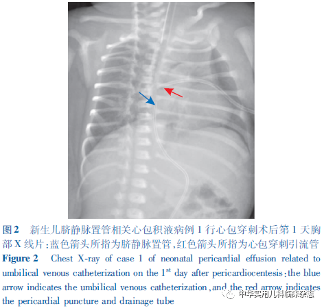 病例资料1.1 病例1 患儿,男,胎龄33+4周,第2胎,第3产,出生体重2 150 g,Apgar评分1 min 8分,5 min 9分,出生后因“早产、呼吸费力10 min”,以新生儿呼吸窘迫综合征(NRDS)收入武汉大学中南医院妇儿医院儿科NICU。入院后予经鼻持续气道正压通气(nCPAP),出生后10 h予UVC(法国美德 PRODIMED 3.5F),过程顺利,置管深度采用Shukla公式计算(1.5×出生体重+5.6+脐带残端长度)[2],床旁X线示导管尖端位于胸椎T8水平。出生后34 h患儿出现血氧饱和度(SpO2)、心率(HR)及血压(BP)下降,肤色苍灰、发花,呼吸节律慢,心音微弱,立即行气管插管及复苏囊正压通气,SpO2缓慢回升,但HR仍持续下降,予生理盐水扩容、肾上腺素强心、碳酸氢钠纠酸及持续心肺复苏,效果不佳。急行床旁彩超提示心包腔大量液性暗区(图1),立即行心包穿刺及闭式引流,术后患儿生命体征逐渐平稳,连续2 d复查彩超均未显示心包积液,复查胸片见UVC导管尖端上移至胸椎T6水平(图2),遂予拔除。心包积液送检结果提示:葡萄糖69.24 mmol/L,乳糜实验阴性,细菌培养阴性,与当天输注的不含脂肪乳静脉营养液成分相符,考虑心包积液主要为经UVC渗漏的静脉营养液。患儿住院治疗24 d出院,目前10月龄,生长发育良好,无心血管及神经系统后遗症。