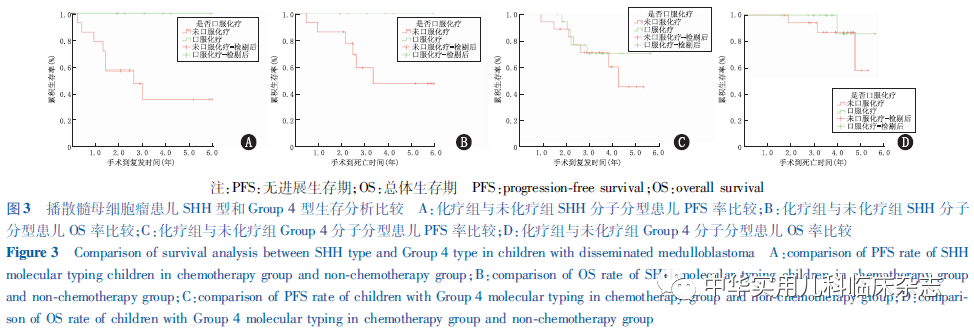 讨论MB约占儿童中枢神经系统肿瘤的25%[1]。根据MB危险因素分层,确诊时为M+的3岁以上患儿无论是何病理类型或分子类型均属高危或极高危类型[1,9],提示与不良预后有关。对于分期为M1和M2/M3的患儿,5年PFS率分别为58.8%、43.1%[10],因此,如何提升M+患儿的PFS及OS是需进一步探索的问题。von Bueren等[11]采用HIT2000方案治疗123例儿童转移性MB的临床研究显示,5年PFS率为62%,5年OS率为74%。本研究中M+患儿5年PFS率为(64.6±6.2)%,5年OS率为(78.4±6.1)%,结果与之相近。Dufour等[12]对高危MB患儿进行的 Ⅱ 期临床研究(NCT00936156)结果显示,5年PFS率78%,5年OS率76%,5年OS率与本研究结果相近。Leary等[13]采用异维甲酸及卡铂治疗3~21岁高危MB患者,总体5年PFS率为62.9%,OS率为73.4%,与本研究结果相近。本研究SHH及Group 4分子分型患儿生存分析显示,SHH分子分型患儿完成规律治疗后口服依托泊苷维持可更好提高其5年PFS率。尽管2组间SHH分子分型患儿的5年OS率差异无统计学意义,但化疗组SHH分子分型患儿无死亡病例,提示口服依托泊苷有降低病死率的趋势,也可能与样本量较少有关。2组间Group 4分子分型患儿PFS率及OS率差异均无统计学意义,但化疗组Group 4分子分型患儿复发率及死亡率均低于未化疗组Group 4分子分型患儿,呈服药后改善预后的趋势,可通过提高样本量或延长随访时间行进一步研究。依托泊苷作为一种经典抗肿瘤药物,已被广泛用于多种肿瘤的治疗。口服依托泊苷单用或联合阿帕替尼等用于治疗难治性或复发的卵巢癌取得了良好的疗效[14]。Ashley等[15]对7例4~16岁复发MB的患儿采用口服依托泊苷进行治疗,结果6例患儿部分缓解,1例患儿疾病处于稳定状态,且患儿均耐受良好,提示口服依托泊苷在复发MB中具有良好的治疗效果。Ruggiero等[16]对进展或复发的MB患儿行替莫唑胺联合依托泊苷口服化疗结果显示,14例患儿中,1例患儿达到完全缓解,2例患儿部分缓解,7例患儿病情稳定,结果提示该方案对于复发或进展的MB患儿具有良好的抗肿瘤效果。本研究结果显示,口服依托泊苷化疗维持后可有效减少MB的复发概率,有利于改善预后,与上述报道结果相符。口服依托泊苷维持化疗的过程中最常见的不良反应发生部位为血液系统(骨髓抑制)及消化系统(恶心、呕吐等),这与既往研究报道相似[17-18]。骨髓抑制以轻度为主,少数患儿出现中重度骨髓抑制。 综上,本研究总结了播散MB患儿口服依托泊苷维持治疗的效果,结果显示,放疗及静脉化疗结束的患儿,在结束静脉化疗后的6~12个月采用口服依托泊苷化疗维持的方法,可进一步提高5年PFS率及5年OS率,为播散MB患儿提供了可选的治疗方案。未来可设计随机对照试验,扩大样本量,延长随访时间,对口服维持治疗的方案行进一步探索。作者贡献声明:刘晶晶:数据整理、图表制作、文章撰写;杜淑旭、张金、孙艳玲:统计分析、数据整理;龚小军、李舒婷、王圆、刘妍:数据整理;武万水、孙黎明:研究指导、论文修改