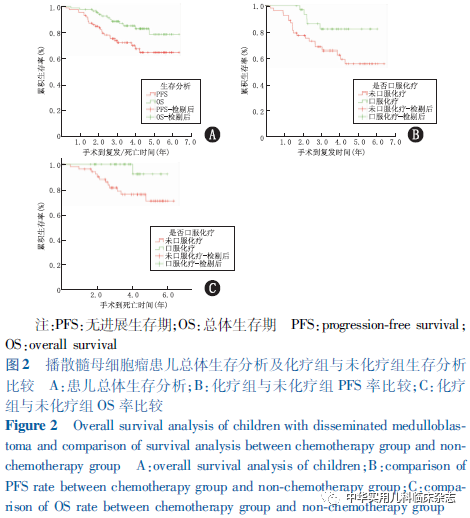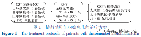髓母细胞瘤(MB)是最常见的儿童神经系统恶性肿瘤,目前在手术、放疗、化疗等综合治疗下,5年生存率可达70.0%~80.0%[1],然而,MB复发患儿1年总生存率仅为44.8%[2],5年生存率仅为10.0%[3]。伴播散的MB患儿复发概率更高,约40%的患儿在诊断时,其MB已播散,MB的软脑膜播散与不良结局关系密切,几乎均伴随MB患儿死亡[4-5]。随着儿童MB治疗疗效的提升,如何提高播散及复发MB患儿的治疗效果逐渐成为目前儿童MB治疗的重要挑战。现就首都医科大学附属北京世纪坛医院收治的经序贯方案化疗后,口服维持治疗的伴播散MB患儿资料进行分析,旨在为播散MB患儿提供参考治疗方案。