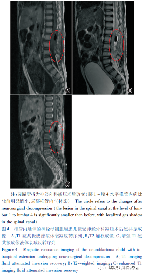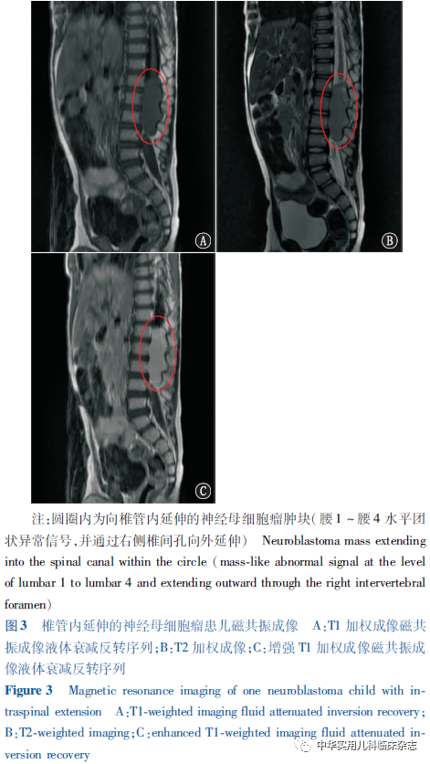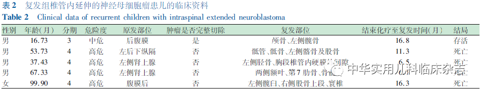 神经母细胞瘤(NB)是起源于交感神经系统的恶性肿瘤,也是儿童时期最常见的颅外实体肿瘤,可累及任何部位[1-2]。7%~15%的NB发生于交感神经侧链,在肿瘤进展过程中通过浸润1个或多个椎间孔将大小不等的成分延伸至椎管内[3-4],最终发展为“椎管内延伸的NB”。“椎管内延伸”定义为:(1)轴向平面超过1/3的椎管被肿瘤侵入;(2)环脊髓软脑膜间隙消失;(3)脊髓信号异常[5]。发生椎管内延伸的NB患儿早期可无明显症状,在肿瘤向椎管内延伸的过程中逐渐压迫脊髓或神经根,导致患者出现感觉障碍、运动障碍或括约肌功能障碍等运动神经系统症状,这是一种紧急的医疗情况,需要立刻开始治疗,以防止神经出现永久性且不可逆的改变。本研究对椎管内延伸的NB患儿的临床特征、复发风险和预后进行分析,并随访椎管内延伸的NB患儿的长期健康问题,以提高家长及儿科医师的认识,缩短首次症状到诊断的时间窗。