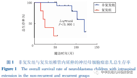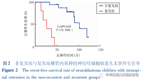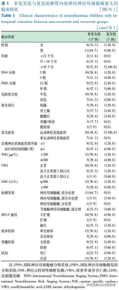 结果2.1 椎管内延伸的NB患儿的基本特征 22例椎管内延伸的NB患儿中位诊断年龄36.3(4.0~99.9)个月,中位随访时间66.4(15.0~123.1)个月。12例(54.5%)患儿发生事件,其中5例(22.73%)患儿出现复发,3例患儿在治疗过程中发生疾病进展,4例患儿死于原发疾病或化疗相关并发症。按照有无复发将22例患儿分为非复发组(17例)和复发组(5例)(表1)。