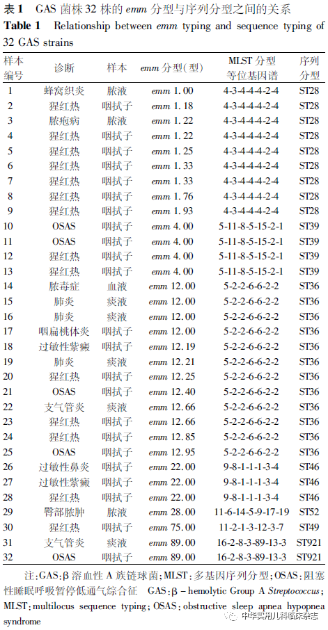 结果emm 1.00及其亚型、emm 4.00、emm 12.00及其亚型、emm 22.00、emm 28.00、emm 75.00和emm 89.00的GAS克隆群分别属于MLST分型中的ST28、ST39、ST36、ST46、ST52、ST49和ST921。32株来自32例患不同疾病、分属于不同emm 分型及其亚型的GAS菌株MLST分型的详细信息见表1。