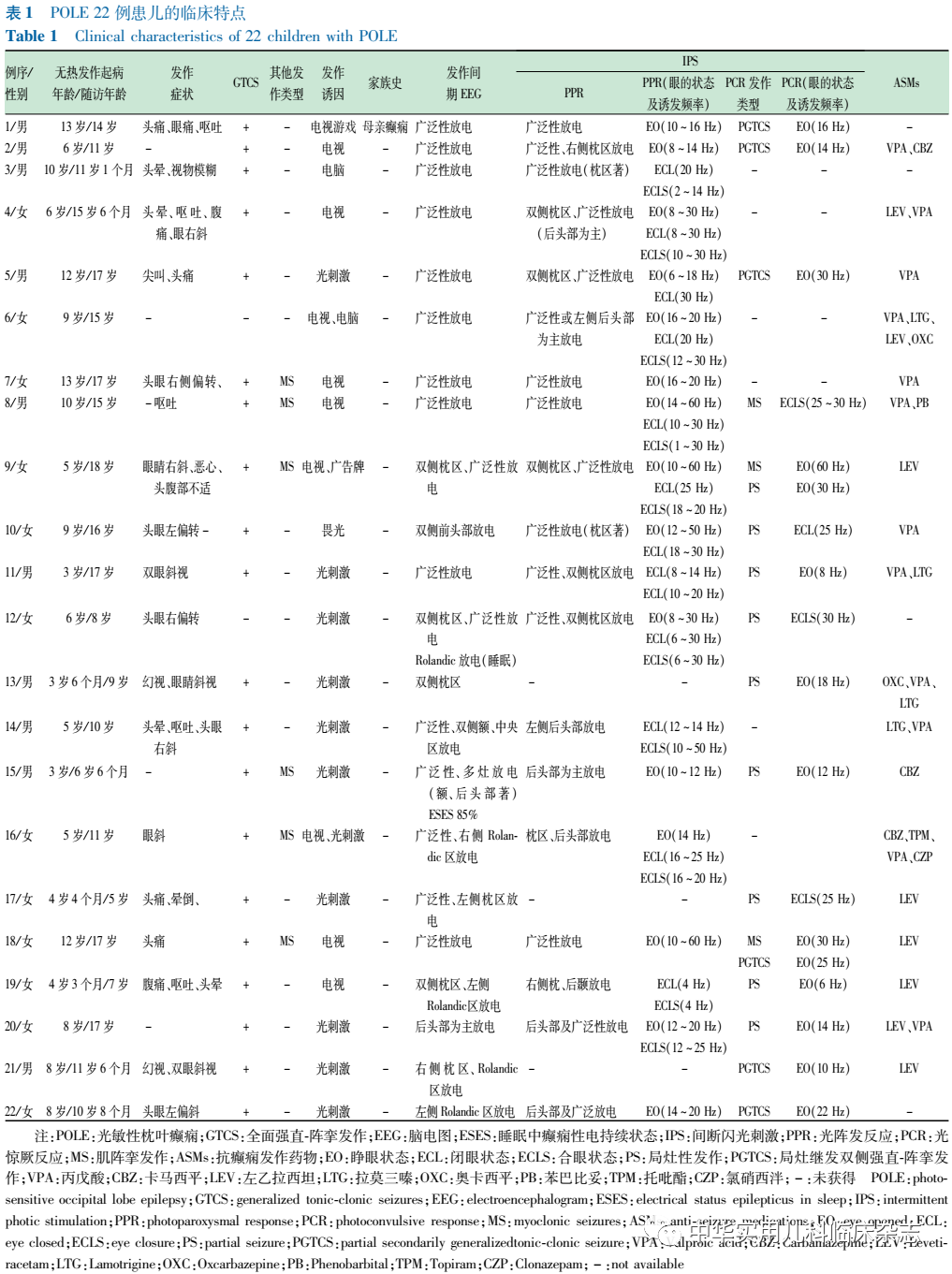 结果2.1 一般资料 22例患儿中女12例,男10例。6例有热性惊厥史,无热抽搐起病年龄为3~13岁,中位年龄7.4岁。例1母亲幼年时无热抽搐3次,其余患儿无特殊家族史。18例起病前后智力运动发育正常;例2、例5、例21起病前有轻度智力发育落后,例15起病前精神运动发育中度落后,诊断为孤独症谱系障碍,此4例均完善了基因检测,均未发现相关的致病基因。例11在15岁时出现多动、注意力不集中,同时诊断为注意缺陷多动障碍,并服用盐酸托莫西汀治疗。所有病例神经影像学未见异常。22例POLE患儿临床特点见表1。