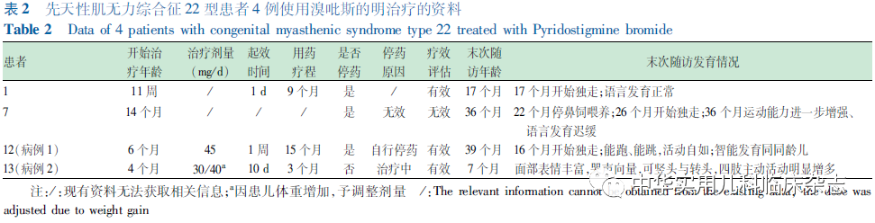 讨论PREPL基因位于2p21,编码PREPL蛋白,其功能缺陷引起CMS22型,呈常染色体隐性遗传[3,15]。本研究2例均为PREPL基因变异。病例1为少见的母源性单亲二倍体导致的纯合移码变异c.1282_1285del(p.F428fs*18)。病例2为复合杂合变异,父源性与上述患者相同的移码变异,母源性单等位基因的无义变异和剪切变异c.[1501G>T;2020+1G>T],p.[G501*;-]。目前认为PREPL基因变异导致的致病机制为功能丧失[7-8,10]。患者母源性的无义变异的位点位于10号外显子,该变异可导致氨基酸编码提前终止,可能激活无义变异介导的mRNA降解(NMD)机制导致基因功能丧失;另一个经典剪切变异的位点位于12号内含子,该变异被预测影响mRNA的剪接,同样可能导致基因功能的丧失。两个变异均疑为功能丧失变异,且均为罕见变异,但由于无义突变位于前端,因此推测无义变异才是导致母源性等位基因功能丧失的致病变异。本研究中2例患儿来自两个家庭,但基因检测到同一个框移变异,是否为PREPL基因变异可能存在热点区域或奠基者效应值得后续关注。13例患儿共发现6个缺失变异(其中5个变异导致起始密码缺失、终止密码缺失或移码,1个变异为框内缺失)、5个无义变异、4个剪切变异、4个框移变异,1个错义变异。框内缺失与错义变异患儿临床表现与其他功能丧失变异无明显差异,因而变异与临床严重程度和预后暂未发现相关性。随着变异报道的增多,有待进一步发掘。关于CMS22患者临床表型, Shchagina等[9]认为患者表现为严重的新生儿肌张力低下、肌无力和喂养困难。在儿童时期,患儿会出现食欲亢进并伴肥胖倾向。Abicht等[16]认为患者表现为先天性肌张力低下、喂养困难、上睑下垂和近端肌无力、生长激素缺乏。本研究中2例患儿均出现新生儿肌张力低下、肌无力、喂养困难,与文献报道[9,16]一致。文献报道的11例中有7例发现认知障碍[7-13],本研究中病例1未进行发育评估,但监护人反馈“语速慢”,病例2仅随访至7个月,提示仍需关注2例患儿的认知发育。文献报道的11例中有6例发现生长激素缺乏,4例发现肥胖症,1例(患儿11)发现卵巢缺如及子宫发育不全、小头畸形及短颈、高促性腺激素性性腺功能减退[7-13],而本研究2例目前身长(高)均正常,体重在正常范围,未见性腺功能减退临床表现,但患儿年龄小,未来是否出现,需长期密切随访,必要时内分泌科联合诊治。由于报道病例数尚少,PREPL临床表型仍在不断积累中,基因型与表型之间关系有待进一步阐明。PREPL缺陷导致临床表型的具体机制并不明确。PREPL是丝氨酸蛋白酶家族成员,它的一个已知功能是网格蛋白相关衔接蛋白 1(AP-1)的活化剂。在胆碱能神经元末梢,新合成的乙酰胆碱(ACh)在囊泡乙酰胆碱转运蛋白的作用下,储存至囊泡内。当神经冲动到达末梢时,ACh被释放到突触间隙,产生骨骼肌收缩等多种生理作用。囊泡乙酰胆碱转运蛋白的运输取决于 AP-1,因此 PREPL的缺失为突触间隙ACh的减少提供了合理的解释,也为胆碱酯酶抑制剂溴吡斯的明治疗 CMS22 提供了潜在的解释[17]。关于CMS22患者的治疗,文献建议使用溴吡斯的明[4],但关于溴吡斯的明治疗的年龄、疗效以及该疾病的自然史提及不多。目前文献中可发现的有治疗信息的患儿仅2例。Engel[2]、Abich等[16]均认为胆碱酯酶抑制剂可能对婴儿期患儿有益。文献报道的患儿1和患儿7,分别在婴儿期11周、幼儿期14个月使用溴吡斯的明治疗,前者1 d后明显起效,后者却无明显疗效[8,10]。本研究病例1和病例2 分别在婴儿期6个月及4个月开始治疗,1周后及10 d后明显起效,支持上述胆碱酯酶抑制剂对婴儿期患儿有益的观点,同时亦显示药物起效快。治疗有效的3例病例中2例(本病例2由于年龄小,未达到独走的年龄)分别为16个月、17个月独立行走,接近正常,较其他大多数未治疗的患者独走年龄提前,提示早期治疗可能促进运动发育。治疗有效的3例病例中除1例目前仍在治疗中,其余2例患者分别在疗程9个月、疗程15个月停药后,运动发育仍能逐渐进步或维持,并且其余未治疗患儿最终均能独立行走,表明该疾病随着年龄的增长肌无力症状也可能会逐渐改善,与Engel[2] 和Régal等[8]的观点一致。虽然目前治疗病例数少,但可以肯定的是婴儿早期使用胆碱酯酶抑制剂后可以明显改善症状,且停药后及未治疗患儿发育能继续进步。综上所述,CMS22新生儿期起病,以喂养困难、运动发育迟缓为主要临床症状,可伴认知障碍、生长激素缺乏、肥胖症,遗传检测帮助诊断。由于胆碱酯酶抑制剂可能在婴儿早期治疗更有益,故早期精准诊断与正确的药物治疗十分必要。作者贡献声明:唐美玲:采集数据、统计分析、论文撰写;李文辉:病例随访、统计分析、对文章的知识性内容作批评性审阅;周水珍:设计方案、对文章的知识性内容作批评性审阅、经费支持