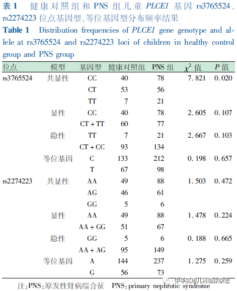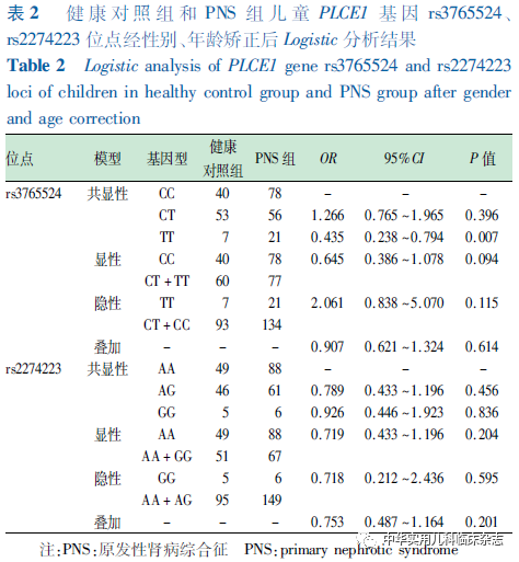 结果2.1 SNP位点与PNS发病风险关系 对健康对照组rs3765524、rs2274223位点进行Hardy-Weinberg平衡分析,两位点的基因型频数符合Hardy-Weinberg平衡(rs3765524:χ2=3.593,P=0.058;rs2274223:χ2=1.985,P=0.159),样本有群体代表性。PNS组与健康对照组中rs3765524、rs2274223位点在共显性、显性、隐性分析模型下分析两组的基因型频率,提示两组rs3765524位点在共显性遗传模型下基因型分布差异有统计学意义(χ2=7.821,P=0.020)(表1)。在共显性、显性、隐性、叠加4种遗传模型下纳入性别、年龄因素进行Logistic回归分析,提示rs3765524位点与广西壮族儿童PNS发病风险有关联,在共显性模型下TT基因型降低广西壮族儿童PNS发病(OR=0.435,95%CI=0.238~0.794,P=0.007)(表2)。rs2274223位点与广西壮族儿童PNS发病无关联。