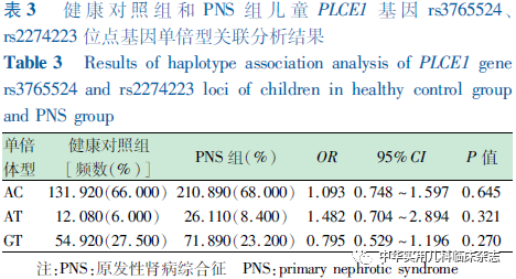 目的 探讨PLCE1基因单核苷酸多态性(SNP)与广西壮族儿童原发性肾病综合征(PNS)的相关性。方法 本研究为回顾性研究,采用病例对照研究选取2017年1月至2021年1月在右江民族医学院附属医院就诊的广西壮族儿童PNS 155例(PNS组),同期体检的广西壮族健康儿童100例(健康对照组),采用二代基因测序技术对PLCE1 SNP rs3765524、rs2274223进行基因分型,并分析其与PNS发病的相关性。相关性分析采用Logistic回归分析,组间比较采用χ2检验或Fisher′s确切概率法。结果 1.与健康对照组比较,PNS组患儿中PLCE1 rs3765524 与广西壮族儿童PNS的发病风险关联,在共显性模型中TT基因型可能降低广西壮族儿童PNS发病风险(OR=0.435,95%CI:0.238~0.794,P=0.007);PLCE1 rs2274223位点基因型及等位基因分布频率差异均无统计学意义(均P>0.05)。2.PLCE1基因 rs3765524、rs2274223两位点存在强连锁不平衡。3.PNS组与健康对照组中单倍体型AC、AT、GT分布频率差异均无统计学意义(均P>0.05)。结论 PLCE1基因rs3765524位点的SNP可能与广西壮族儿童PNS发病风险关联,TT基因型可能为广西壮族儿童PNS的保护基因。
