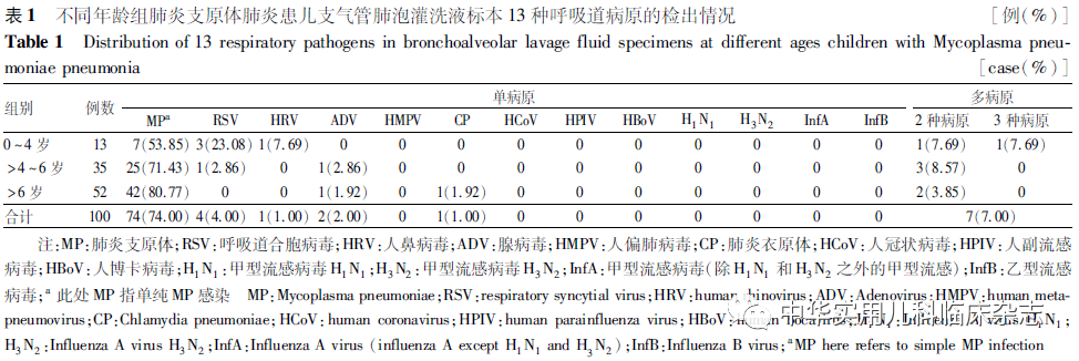 结果2.1 一般资料 共收集到100例MPP患儿的BALF标本。其中男47例(47.0%),女53例(53.0%);0~4岁组13例,>4~6岁组35例,>6岁组52例。2.2 荧光定量PCR法检测MP及其耐药基因结果 100例患儿BALF标本中,83例(83.00%)MP阳性,其中78例(93.98%)存在耐药基因点突变,均为23S rRNA结构域V区A2063G的点突变。0~3岁组MP的阳性率为 61.54%(8/13例),耐药率为100.00%(8/8例);4~6岁组MP阳性率为80.00%(28/35例),耐药率为89.29%(25/28例);>6岁组MP阳性率为90.38%(47/52例),耐药率为95.74%(45/47例)。各组耐药率比较差异无统计学意义(χ2=1.897,P=0.168)。2.3 多重PCR呼吸道病原检测结果 100例患儿BALF标本中,89例(89.00%)可检测到病原。病原阳性标本中,79例(79.00%)检测到MP,其中74例(74.00%)标本仅检出MP,5例(5.0%)标本同时检出其他病原(分别为MP+RSV+HPIV、MP+HRV、MP+ HCoV、MP+ HMPV、MP+ InfA);10例(10.00%)标本检测出其他病原,其中4例(4.00%)检出RSV;2例(2.00%)检出ADV;1例(1.00%)检出HRV;1例(1.00%)检出CP;1例(1.00%)检出HPIV和HCoV;1例(1.00%)检出InfA和HBoV(表1)。不同年龄组MP检出率(包括单纯MP感染和MP混合病毒感染)分别为0~4岁组61.54%(8/13例),>4~6岁组77.14% (27/35例),>6岁组84.62% (44/52例),各组间比较差异无统计学意义(χ2=3.450,P=0.178)。不同年龄组病毒检出率分别为0~4岁组38.46%(5/13例),>4~6岁组8.57% (3/35例),>6岁组3.85%(2/52例),0~4岁组病毒检出率高于>4~6岁组(χ2=4.135,P=0.042)和>6岁组(χ2=9.616,P=0.002)。