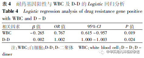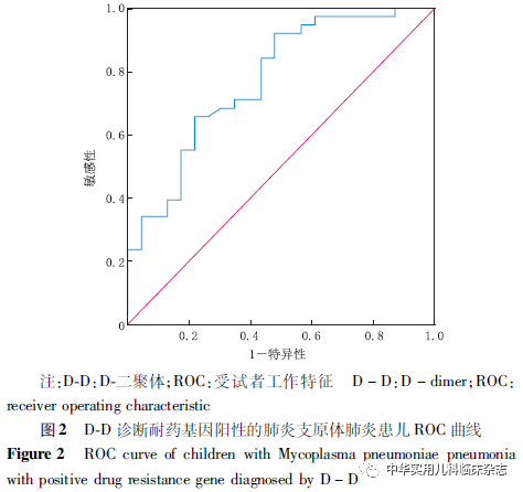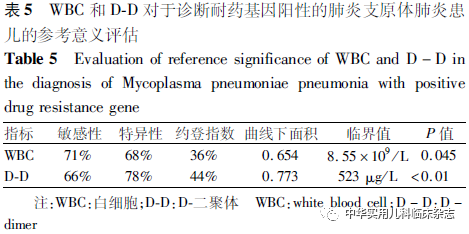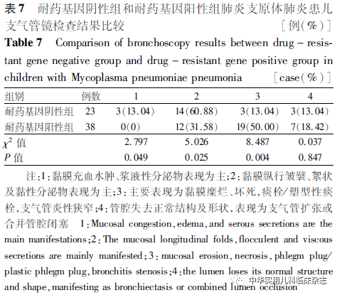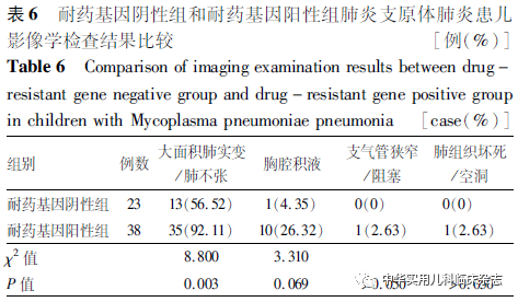 讨论MP是引起儿童非典型肺炎最常见的病原体[12],MP感染轻者能出现自限性的上呼吸道感染症状,严重者可以导致发生肺外并发症的重症MP肺炎[13],甚至危及生命[14]。研究表明,在治疗RMPP早期使用支气管镜肺泡灌洗有助于缩短病程并促进肺部影像学好转,改善临床预后, BALF来源于远端气道及肺泡组织,能够直接反映局部炎症及病原活动情况[15]。国内外将耐药机制的研究热点集中23S rRNA V区基因点突变,其中以2063位点发生A→G最为常见,突变率高达98%以上[16-17],提示了MP对大环内酯类抗生素的耐药性[18],推测其与RMPP相关[19]。机体对病原体的过度免疫反应在RMPP的发生中起重要作用,由单核/巨噬细胞、T淋巴细胞等产生的细胞因子如IL-6具有多种生物活性,已有研究证明IL-6与RMPP密切相关[20],这可能与其促进炎症反应的作用有关。RMPP发热、咳嗽时间长,病情进展迅速,可出现气促、喘息、胸闷、低氧血症甚至呼吸衰竭等表现,容易合并其他病原体感染,短时间内肺部影像学可以出现大面积肺部实变、胸腔积液、肺组织坏死、肺脓肿、气胸等,远期造成支气管扩张、闭塞性支气管炎等疾病,严重影响患儿的生活质量。RMPP较普通MP肺炎更容易出现肺外系统受累,如血液系统、中枢神经系统、消化系统、泌尿系统及皮肤等,甚至出现全身炎症反应综合征[21-22],可见RMPP对儿童的危害极大,而支气管肺泡灌洗术常作为有效的治疗手段。由于RMPP临床表现多样,容易造成漏诊等后果导致病情进行性加重,因此各种用来在疾病早期预测RMPP严重程度的临床标志物引起了学者们的广泛关注。目前认为RMPP的发病原因包括MP对大环内酯类抗生素的耐药、过度的免疫炎症反应、合并其他病原体感染等[23]。大环内酯类抗生素可以有效治愈MP感染[24-25]。研究表明,MP对大环内酯类药物的耐药率的地区差异性与大环内酯类药物使用频率密切相关[26]。已有多位学者证明耐大环内酯类药物的MP常在23S rRNA 基因V区发生A2063G突变,且在RMPP中产生耐药的比例要远远高于普通型MP肺炎,重症比例增加[19,27-28]。本研究发现在38例耐药基因阳性患儿中有28例(73.68%)为RMPP,23例耐药基因阴性患儿中有7例(30.43%),差异有统计学意义,推测耐药基因阳性与RMPP具有一定的相关性。本研究发现,2组患儿的年龄、性别无明显差异,而耐药基因阳性组的发热时间及住院天数较耐药基因阴性组更长,肺外并发症的发生率更高,这与其他研究得出的结论相同[27,29]。感染性疾病临床表现的严重程度可以用病原体及机体的平衡关系解释,过度的炎症反应可能导致细胞因子释放和免疫紊乱[30]。有研究表明[31],23S rRNA V区2063位点基因型发生突变可能影响DNA载量的变化,局部MP-DNA载量能够客观反映病原与机体免疫清除能力之间的平衡,耐药组MP-DNA载量高于非耐药组,而MP可以通过其毒素或代谢产物直接损伤呼吸道上皮,也可以引起全身过度炎症反应,这可能是导致耐药基因阳性组患儿发生肺外并发症更多的原因之一,而免疫状态的改变是否能够诱发耐药株基因突变还有待研究。已有研究表明[28],耐药性MP肺炎较非耐药性MP肺炎发生低氧血症及呼吸困难更多,但本研究结果提示2组患儿发生低氧血症无明显差异性,这可能与研究标本量过少有关。结合既往大量研究,可见耐药性MP肺炎对儿童危害极大,因此尽早识别MP耐药性并制定适当、合理的治疗方案非常重要。本研究收集了临床中常见的非特异性化验指标,发现与耐药基因阴性组相比,耐药基因阳性组的CRP、PCT、D-D、血清IL-6水平更高,而WBC水平较低,并对以上指标进行Logistic回归分析,WBC和D-D的水平与耐药基因阳性有相关性,对MP耐药性的早期识别具有一定的参考意义,而2组BALF中IL-6水平比较差异无统计学意义,说明代表局部病灶炎症反应的BALF中IL-6水平对预测MP耐药性无意义,提示耐药性MP肺炎引起的全身过度免疫炎症反应更需要引起广泛关注。本研究还发现,耐药基因阳性组35例(92.11%)表现为大面积肺实变/肺不张,其中有10例伴胸腔积液,1例伴支气管狭窄/阻塞,1例伴肺组织坏死/空洞。本研究发现耐药基因阳性组较耐药基因阴性组更容易发生大面积肺实变或肺不张,与其他学者研究结果相符[32]。而将2组患儿支气管镜下表现进行比较,发现耐药基因阳性组主要表现为黏膜糜烂、坏死,痰栓/塑型性痰栓及支气管炎性狭窄,耐药基因阴性组以黏膜纵行皱襞、絮状及黏性分泌物表现为主,差异均有统计学意义,可见耐药基因阳性组的镜下表现整体重于耐药基因阴性组,说明严重的支气管镜下表现与MP耐药性具有一定的相关性,有助于指导临床更为合理的用药,缩短治疗天数,改善患儿临床预后。本试验亦存在着一定的局限性。首先,本研究仅检测了BALF中23S rRNA基因V区的2063位点,若该位点发生基因突变则认为存在耐药性,虽然在已知的基因位点中,发生A2063G突变的比例最高达99.5%以上[33],但仍不能除外在其他位点,如2064、2067等发生变异,造成分组时存在假阴性的结果;其次本研究样本量较少,相关因素统计不足,部分结果存在偏差,且未在治疗上做相关研究,存在一定缺陷。综上,23S rRNA V区基因发生A2063G突变的MP肺炎患儿的临床表现、影像学和支气管镜下表现更重。血液中WBC及D-D水平的高低对早期识别耐药基因具有一定意义,耐药基因阳性的MP肺炎引起的全身过度免疫炎症反应需要引起重视。