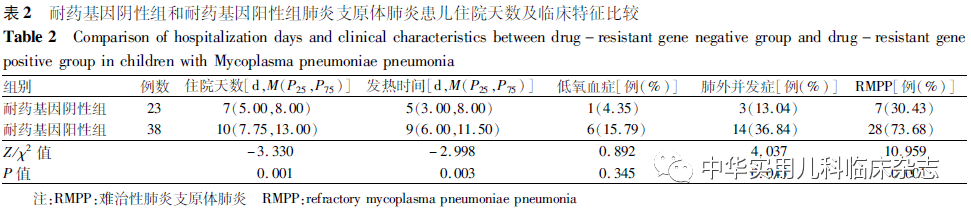 资料与方法1.1 研究对象 本研究为回顾性分析。收集2017年10月至2018年6月中国医科大学附属盛京医院小儿呼吸内科确诊为MP肺炎并行纤维支气管镜肺泡灌洗术检查的61例住院患儿临床资料。男31例,女30例,年龄1~14 岁。根据支气管肺泡灌洗液(BALF) 中MP 23S rRNA V区基因的2063位点突变情况分为MP耐药基因阳性组38例,MP耐药基因阴性组23例。纳入标准:参照《诸福棠实用儿科学》第8版[8]MP肺炎的诊断标准,通过血清学检测MP抗体IgM阳性,或合并鼻咽拭子PCR检测MP DNA阳性。而在确诊MP肺炎的基础上应用大环内酯类抗生素1周或1周以上,临床症状仍不缓解或伴影像学加重,则为RMPP。排除标准:(1)血液细菌培养或BALF细菌培养阳性、细菌涂片阳性的患儿,或合并病毒感染、肺结核、真菌感染、支气管哮喘、支气管肺发育不良及其他肺部疾病;(2)行支气管肺泡灌洗术前曾应用糖皮质激素及免疫调节剂治疗;(3)患有先天性心脏病或同时患有免疫缺陷病的患儿,血液病或肿瘤疾病,心脏功能严重减退有心力衰竭表现者,有明显的心律失常以及不能配合完成支气管肺泡灌洗术的患儿。纳入研究的患儿临床症状及影像学表现均符合纤维支气管镜肺泡灌洗术的指征[9],本研究通过医院医学伦理委员会批准(批准文号:2016PS251K),并征得患儿监护人知情同意。1.2 研究方法1.2.1 BALF中MP耐药基因检测 留取BALF后将其储存于-80 ℃冰箱待测,参考既往报道[10-11]对23S rRNA V区的引物序列进行扩增,由武汉金开瑞生物工程有限公司合成。上游引物:5′-GGGGAAGAGCCCAGAT-3′,下游引物:5′-GTCCAGGAAACCTTAGTCAA-3′。PCR循环条件:94 ℃预变性3 min;94 ℃变性30 s,55 ℃退火 30 s,72 ℃延伸30 s,共30个循环;72 ℃终延伸5 min;反应结束后取5 μL反应产物进行琼脂糖凝胶电泳检测。最后确定23S rRNA V区2063位点基因型。1.2.2 BALF中白细胞介素6(IL-6)检测 采用双抗体一步夹心法酶联免疫吸附试验(ELISA)测定IL-6水平,由上海酶联生物科技有限公司提供,过程严格按说明书操作。根据病史资料,记录以下指标:性别、年龄、发热持续时间、住院天数、有无低氧血症、是否合并肺外并发症、实验室常规检查、影像学结果、纤维支气管镜镜下表现等。1.3 统计学处理 使用SPSS 22.0统计学软件处理数据,符合正态分布的计量资料以x̄±s表示,组间比较采用t检验;非正态分布的计量资料以M(P25,P75)表示,组间比较采用秩和检验;计数资料用率表示,率的比较采用χ2检验,理论频数<5或总例数<40用Fisher′s确切概率法。P<0.05为差异有统计学意义。对差异有统计学意义的自变量进行多因素Logistic回归分析。