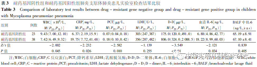 结果2.1 一般资料 本研究共收集61例患儿,其中男31例(50.82%),女30例(49.18%)。根据BALF中MP 23S rRNA V区基因的2063位点突变情况分为MP耐药基因阳性组38例(62.30%),MP耐药基因阴性组23例(37.70%)。患儿性别及年龄差异均无统计学意义(均P>0.05)(表1)。