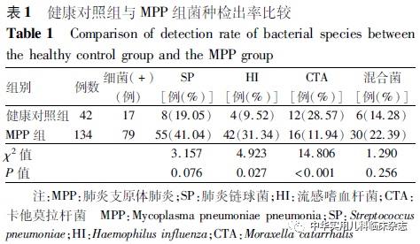结果2.1 健康对照组与MPP组细菌检出情况比较 MPP组细菌检出率高于健康对照组[58.96%(79/134例)比40.48%(17/42例)],差异有统计学意义(χ2=4.404,P<0.05)。在菌种方面,2组间SP检出率差异虽无统计学意义(P>0.05),但MPP组中SP检出率高于健康对照组;MPP组HI检出率高于健康对照组,健康对照组CTA检出率高于MPP组,差异均有统计学意义(均P<0.05);MPP组混合菌比例高于健康对照组,但差异无统计学意义(P>0.05);MPP组混合菌以HI+SP混合为主,健康对照组以CTA+SP混合为主(表1)。