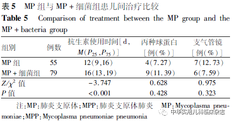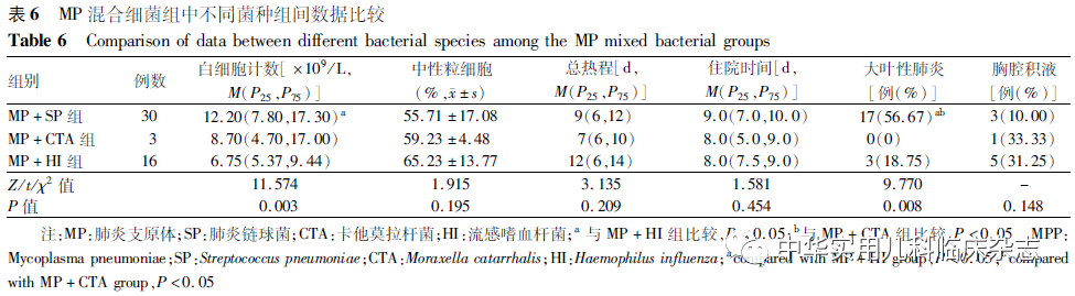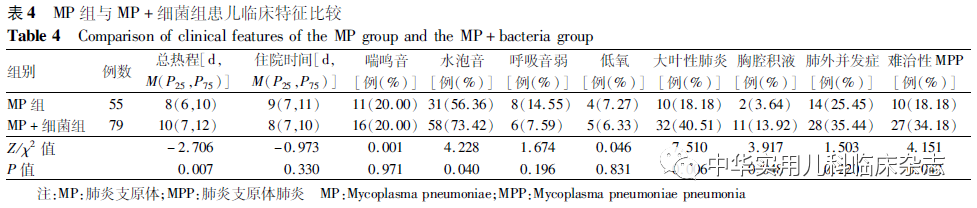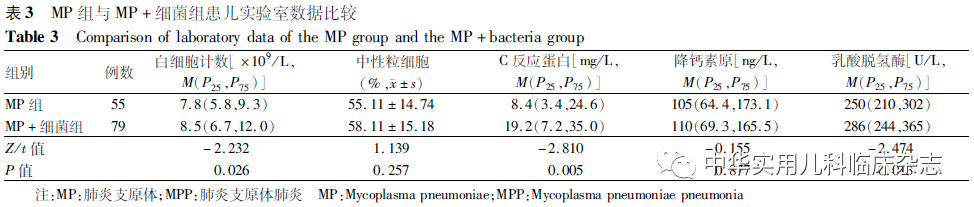 目的 了解肺炎支原体肺炎(MPP)患儿口咽部常见细菌及临床意义。方法 回顾性分析。选取中国医科大学附属盛京医院小儿呼吸内科2016年12月至2017 年6月住院治疗的134例MPP患儿为研究对象,选取同期同医院42例健康儿童为健康对照组。采用荧光定量聚合酶链反应Taqman探针法检测入组儿童口咽部常见细菌[肺炎链球菌(SP)、卡他莫拉杆菌(CTA)、流感嗜血杆菌(HI)]。首先比较MPP患儿及健康儿童口咽部细菌检出情况,再将134例MPP患儿根据年龄(<1岁、1~<3岁、3~<6岁及6~14岁)、有无细菌检出[肺炎支原体(MP)、MP+细菌]及检出菌种不同(MP+SP、MP+CTA及MP+HI)进行分组比较。采用秩和检验及χ2检验对相关临床资料进行分析。结果 134例MPP患儿检出细菌79例(58.96%),42例健康儿童检出细菌17例(40.48%),差异有统计学意义(χ2=4.404,P<0.05)。与MP组相比,MP+细菌组外周血中白细胞(WBC)水平[8.5(6.7,12.0)×109/L比7.8(5.8,9.3)×109/L,Z=-2.232]、C反应蛋白(CRP)水平[19.2(7.2,35.0) mg/L比8.4(3.4,24.6) mg/L,Z=-2.810]、乳酸脱氢酶(LDH)水平[286(244,365) U/L比250(210,302) U/L,Z=-2.474]及大叶性肺炎比例[40.51%(32/79例)比18.18%(10/55例),χ2=7.510]、胸腔积液比例[13.92%(11/79例)比3.64%(2/55例),χ2=3.917]、难治性肺炎支原体肺炎(RMPP)比例[34.18%(27/79例)比18.18%(10/55例),χ2=4.151]均较高;总热程[10(7,12) d比8(6,10) d,Z=-2.706]及抗生素使用时间[16(13,19) d比12(9,16) d,Z=-3.747]均较长,差异均有统计学意义(均 P<0.05)。MP+SP组外周血中WBC高于MP+HI组[12.20(7.80,17.30)×109/L比6.75(5.37,9.44)×109/L],差异有统计学意义(Z=11.574,P<0.05);MP+SP组[56.67%(17/30例)]大叶性肺炎发生率高于MP+CTA组[0(0/3例)]和MP+HI组[18.75%(3/16例)],差异有统计学意义(χ2=9.770,P<0.05)。结论 MPP患儿口咽部更易发生细菌定植或感染,当WBC、CRP及LDH均明显升高,影像表现为大片实变影或有胸腔积液时,提示可能混合细菌感染,热程更长,难治性MPP比例增高,且常见的混合细菌为SP。