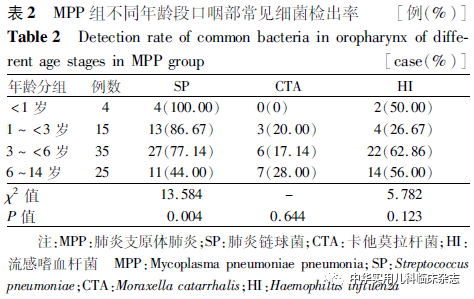 资料与方法1.1 研究对象 回顾性分析。选取2016年12月至2017 年6月于中国医科大学附属盛京医院小儿呼吸内科病房住院治疗的134例MPP患儿为研究对象,选取同期同医院的42例无呼吸道感染症状的健康儿童为健康对照组。入选标准:(1)年龄1个月~14岁;(2)符合儿童社区获得性肺炎管理指南中MPP诊断标准[8]。排除标准:(1)有气管、支气管发育不良或畸形者;(2)有先天性心脏病、先天遗传代谢病、免疫缺陷病者;(3)入院前6个月内有明确下呼吸道感染病史者。MP感染诊断标准[9]:(1)恢复期较急性期血清MP抗体滴度上升4倍或下降为原来的1/4;(2)MP-IgM抗体阳性;(3)鼻咽拭子或肺泡灌洗液中MP-DNA阳性。满足以上3个条件中的任意2条即诊断为MP感染。本研究通过医院医学伦理委员会批准(批准文号:2020PS808K),患儿监护人均知情同意。1.2 方法 1.2.1 标本采集与资料收集 134例MPP患儿入院 24 h 内采集静脉血1~2 mL。入院当天采集口咽拭子。均低温保存,集中检测。同期采集42例健康儿童的口咽拭子。收集134例MPP患儿年龄、性别、临床表现、实验室检查、影像学结果及抗生素治疗情况。1.2.2 样本检测 MP-IgM抗体:采用酶联免疫吸附试验(ELISA)检测血清中MP-IgM抗体,试剂购自德国欧蒙医学实验诊断股份公司(EUROIMMUN MedizinischeLabordiagnostikaAG,德国)。采用被动凝集法检测MP特异性抗体滴度,试剂盒名称:赛乐迪亚-麦可Ⅱ(SERODIA-MYCO Ⅱ),生产厂家为日本富士瑞必欧株式会社,货号:YZB/JA 8033-2013。MP-DNA:采用以CARDS编码基因为目的基因的荧光定量PCR检测咽拭子样本[10];SP检测:采用以SP自溶素基因序列为目的基因的荧光定量PCR检测咽拭子样本[11];CTA检测:采用以CTA外膜蛋白多糖COPB基因序列为目的基因的荧光定量PCR检测咽拭子样本[12];HI检测:采用以HIfucK基因序列为目的基因的荧光定量PCR检测咽拭子样本[13],引物及探针均购自美国Invitrogen公司,基因组提取试剂盒购自北京康为世纪生物科技有限公司。操作均严格按照说明书进行。1.2.3 分组 (1)MPP组和对照组,分析2组儿童口咽部细菌检出情况。(2)在MPP组中进行亚组分组:①根据不同年龄段,分为<1岁组、1~<3岁组、3~<6岁组及6~14岁组;②根据患儿口咽部细菌检出结果,分为MP组(口咽部检出细菌阴性)和MP+细菌组(口咽部检出细菌阳性);③根据MP+细菌组患儿口咽部检出的不同菌种,分为MP+SP组、MP+CTA组及MP+HI组。不同菌种间患儿性别比例差异无统计学意义(P>0.05)。1.3 统计学处理 采用SPSS 22.0软件进行统计分析,对于连续性定量资料,首先采用Shapiro-Wilk正态性检验分析,对于服从正态分布资料,采用x̄±s表示,采用t检验。对于单因素方差分析,采用LSD法进行组间两两比较;对于不服从正态分布的资料,采用中位数和四分位数描述,采用秩和检验比较组间差异。计数资料采用频数和构成比描述,采用χ2检验或Fisher′s确切概率法。P<0.05 为差异有统计学意义。