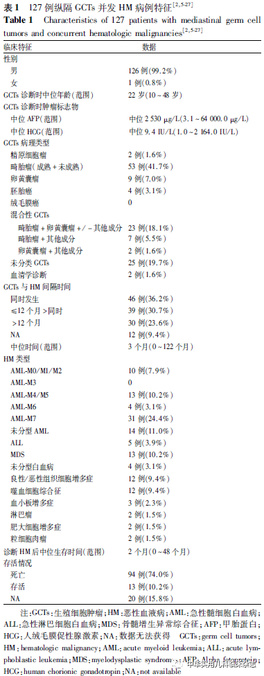 总结纵隔生殖细胞肿瘤(GCTs)并发恶性血液病(HM)患儿的临床特征及治疗预后。回顾性收集2014年11月至2018年9月北京儿童医院肿瘤内科收治的3例纵隔GCTs并发HM患儿的临床资料,检索截至2019年12月PubMed数据库及万方数据库的相关文献并进行文献复习。3例患儿为12~16岁男童,以纵隔占位起病,GCTs病理类型为畸胎瘤或卵黄囊瘤,予手术和化疗治疗。3例在GCTs诊断的5个月、9个月、31个月时分别发生了急性髓细胞白血病(AML)、骨髓增生异常综合征,予对症治疗,2例死亡,1例存活。共检索到英文报道病例135例,其中纵隔GCTs并发HM共127例(94.1%),其他部位GCTs并发HM共8例(5.9%)。文献报道的127例纵隔GCTs并发HM病例中,126例(99.2%)为男性,诊断GCTs的中位年龄为22岁(10~48岁);GCTs病理类型包括畸胎瘤53例(41.7%),含畸胎瘤和/或卵黄囊瘤成分的GCTs共94例(74.0%);HM类型中,AML共72例(56.7%),其中AML-M7共31例(24.4%);GCTs与HM间隔中位时间为3个月(0~122个月),46例(36.2%)患儿2种疾病同时发生,85例(66.9%)在GCTs诊断的12个月内发生HM;可知生存状态的病例107例,其中存活13例(12.1%),死亡94例(87.9%),诊断HM后中位生存时间为2个月(0~48个月)。对于原发纵隔GCTs,尤其病理类型为卵黄囊瘤和/或畸胎瘤成分的青少年男性,需高度关注其HM倾向,此类患者预后极差,异基因造血干细胞移植是可选择的治疗方法。