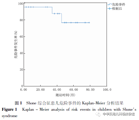 结果2.1 Shone综合征患儿心脏畸形特征 22例患儿左心室流入道病变中,二尖瓣瓣上环17例(77.3%),降落伞二尖瓣8例(36.4%),乳头肌发育不全腱索短小异位5例(22.7%),瓣叶发育不良卷曲增厚3例(13.6%)。在左心室流出道病变中,主动脉弓缩窄17例(77.3%),主动脉瓣狭窄8例(36.4%),主动脉瓣下隔膜8例(36.4%)。在合并的心脏畸形中,发生率依次为室间隔缺损11例(50.0%),动脉导管未闭9例(40.9%),部分型房室间隔缺损、部分型肺静脉异位引流各1例(各占5.6%)。2.2 超声心动图检查结果 22例患儿术前、术后及出院时均行超声心动图检查,观察记录二尖瓣病变及血流情况。二尖瓣狭窄分类:瓣叶发育不良、卷曲增厚3例;乳头肌发育不全腱索短小异位5例;二尖瓣瓣上环17例;落伞二尖瓣8例。左心室流出道病变中,主动脉弓缩窄17例,主动脉瓣狭窄和瓣下隔膜各8例。另外,有1例患儿术前肺动脉重度扩张,轻度肺动脉高压。1例患儿术前并重度肺动脉高压,术前右心导管检查全肺阻力9.9 Wood单位,吸药(伊洛前列素)后5.4 Wood单位。2.3 手术结果 全组患儿无住院死亡病例,体外循环时间(125.9±47.3) min,阻断时间(74.5±28.1) min,呼吸机使用时间(40.2±26.8) h。对比患儿术前与术后二尖瓣流速、左心室流出道流速和主动脉弓缩窄处流速。二尖瓣术后流速[(149.7±38.2) cm/s]较术前[(234.9±34.0) cm/s ]明显下降(t=7.341,P<0.05);左心室流出道术后流速[(202.0±105.0) cm/s]较术前[(328.6±120.3) cm/s]明显下降(t=6.575,P<0.05);主动脉弓缩窄处术后流速[(186.1±60.9) cm/s]较术前[(347.9±100.8) cm/s]明显下降(t=7.630,P<0.05)。2.4 随访结果 术后随访44.0(28.5~58.5)个月,无远期死亡病例,随访期间有2例不完全型Shone综合征患儿出现并发症,1例主动脉瓣二瓣畸形患儿出现主动脉瓣中大量返流,另有1例主动脉瓣二瓣畸形患儿出现主动脉瓣再狭窄,均再次手术。应用Kaplan-Meier生存分析法得到患儿危险事件发生情况,将随访期间严重并发症作为危险事件,随访1年无患儿出现危险事件,随访3年有 91.7% 的患儿无危险事件发生,随访5年有80.2%的患儿无危险事件发生(图1)。