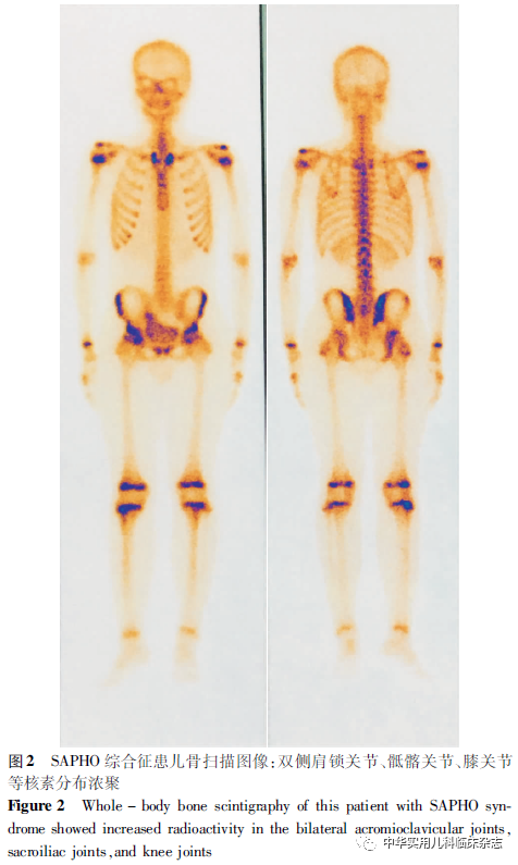 讨论SAPHO综合征于1987年首次由法国风湿病学家CHAMOT提出,指包含滑膜炎(synovitis)、痤疮(acne)、脓疱病(pustulosis)、骨肥厚(hyperostosis)和骨炎(osteomyelitis)的一组综合征[1]。该病多见于30~50岁女性患者,男女比例接近1∶2,国内外儿童发病报道较少[3-4]。该病的具体病因和发病机制不明,可能与感染[5]、自身免疫性炎症反应[6-7]及遗传因素相关[8-9]。本例患儿存在重型痤疮,伴反复低热,抗感染治疗后体温趋于稳定,考虑可能存在感染。该病核心表现为骨关节表现,包括骨炎、骨肥厚、滑膜炎、附着点炎及关节病变。常有病变部位疼痛、软组织红肿及活动障碍。儿童多表现为慢性多发性骨髓炎,四肢和脊柱受累更常见[10-11]。皮肤表现最常见为掌跖脓疱病,其次为重度痤疮(包括聚集性痤疮、暴发性痤疮或化脓性汗腺炎)等[12]。需要注意的是,皮肤表现与骨关节表现并不完全平行,约15%的患者甚至无皮肤表现[4]。本例患儿以皮肤表现为首发症状,骨关节症状与皮肤表现间隔约1个月。二者表现不平行,为其早期诊断造成了困难。该病目前缺乏特异性实验室指标,皮肤活检病理通常提示为中性粒细胞浸润的非感染性脓肿[7]。X线特征性表现包括骨形态不规则、皮质增厚、髓腔密度增加[13]。全身骨扫描对于该病诊断,尤其对于早期或无骨关节症状患者的诊断意义重大。骨扫描 “牛头征”(放射性核素示踪剂在胸肋锁骨双侧较对称区域放射性浓聚)为该病特征性表现[14-15]。该病主要通过病史、临床特征、影像学及组织学病理进行临床诊断。2012年Nguyen等[16]提出SAPHO综合征最新诊断标准:(1)骨关节表现+聚合性痤疮和暴发性痤疮或化脓性汗腺炎;(2)骨关节表现+掌趾脓疱病;(3)骨肥厚伴或不伴皮肤损害;(4)慢性多灶性复发性骨髓炎(CMRO)包含中轴或外周骨,伴或不伴皮肤损害。满足以上4个条件之一并除外化脓性骨髓炎、感染性前胸壁关节炎等其他疾病所致的骨关节症状即可诊断。本例患儿高度怀疑为“SAPHO综合征”,基因检测结果未发现明确致病基因,因此“SAPHO综合征”诊断明确。目前SAPHO综合征尚无统一治疗方案,主要以缓解临床症状、减轻炎症反应、延缓关节病变进展为主。非甾体抗炎药为该病治疗的一线药物,改善病情抗风湿药物及糖皮质激素为二线药物,重型痤疮患者可加用抗生素治疗。近年来,生物制剂的应用发展迅速,在多种儿童疾病中得到应用[17]。该病患者接受生物制剂及靶向药物治疗亦有报道。部分研究表明肿瘤坏死因子拮抗剂效果显著[18-20],但国内外均有应用该药治疗后患者皮疹加重的报道[21-23]。最近研究表明Janus激酶1/3抑制剂(如托法替尼)对该病治疗有效[24]。但限于价格昂贵、样本数量少、应用时间短,该类药物的有效性及安全性仍待进一步观察。本例患儿考虑“SAPHO综合征”诊断后,予塞来昔布、柳氮磺胺吡啶、外用软膏及调节免疫治疗等药物缓解症状。基因结果回报阴性后,诊断明确,加用重组人 Ⅱ 型肿瘤坏死因子受体-抗体融合蛋白治疗。患儿目前皮肤及关节症状明显好转,复查血常规、ESR及CRP均恢复正常。SAPHO综合征较罕见,患者皮肤表现及骨关节表现发病间隔存在不确定性,临床工作中如接诊痤疮患儿,尤其为合并脓疱疮等重型痤疮表现者,即使其处于青春期,也应详细采集病史,追问并随访其骨关节症状,考虑SAPHO综合征的可能。本病预后较好,早期诊断及治疗,可很大程度上提高患儿的生活质量,改善患儿预后。