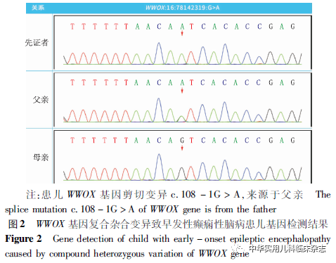 讨论WWOX是短链脱氢酶/还原酶蛋白超家族的成员,其包含2个N端的WW结构域、C端的1个短链脱氢酶/还原酶和1个核定位序列,参与生长、分化、骨骼类固醇代谢和肿瘤抑制等细胞过程,在中枢神经系统的各个部位都有高表达,包括大脑、小脑、脑干和脊髓,对神经退行性变有抑制作用,也有一部分位于线粒体中,执行氧化还原酶功能。编码WWOX的基因位于16q23.1-23.2,并跨越第二常见的脆性位点FRA16D,包含9个外显子。WWOX基因的体细胞变异在不同的人类癌症中被报道,它作为肿瘤抑制基因的作用已经被广泛地认识,而近几年发现其在中枢神经系统疾病,如癫痫性脑病、智力障碍和脊髓小脑性共济失调12型的发病中也起重要作用[2-3]。WWOX基因在2014年首次被确定与癫痫性脑病有关,也有学者称为WWOX基因相关的癫痫性脑病(WOREE综合征),已报道的病例绝大多数癫痫起病年龄小于6个月[4-6],符合EOEE的特征,本例患儿起病年龄为出生后27 d,与文献报道病例一致。目前WWOX基因变异致癫痫性脑病的机制尚不清楚,现有研究表明,WWOX在大脑皮质神经元和海马中高度表达,在神经元的发育、分化和保护中起关键作用,其功能丧失可导致神经元异常兴奋、神经元损伤和神经变性,涉及线粒体功能障碍和细胞凋亡,进而导致脑萎缩和体积丧失[7]。Hussain等[8]在WWOX基因敲除小鼠中观察到,WWOX缺失导致海马γ-氨基丁酸(γ-aminobutyric acid,GABA)能中间神经元数量显著减少,神经炎症活跃的征象,如小胶质细胞活化、星形胶质细胞增生及炎症细胞因子肿瘤坏死因子α(TNF-α)和白细胞介素6(IL-6)的过度表达。WWOX基因变异致癫痫性脑病为常染色体隐性遗传模式,变异类型多为纯合变异和复合杂合变异。在目前报道的变异类型中,片段缺失较常见,这可能与WWOX基因跨越FRA16D脆性位点的结构有关,FRA16D为人类染色体第二常见的脆性位点,脆性位点在一些特殊情况下容易发生断裂、重排或基因重组。虽然目前报道病例数有限,但已发现其表型和基因变异类型有一定的相关性,纯合错义变异表型较轻,多表现为儿童期起病的小脑性共济失调伴癫痫和智力障碍,部分患者有下肢痉挛;基因型为错义变异和染色体微缺失的复合杂合变异患儿往往表现为严重发育迟缓和癫痫性脑病,但无小头畸形、痉挛性四肢瘫、头颅MRI异常;而双等位基因无效变异(无义、剪切位点和缺失)患儿表现为不同形式的严重中枢神经系统疾病,包括严重的全面发育迟缓、早发痉挛性四肢瘫痪、难治性癫痫、进行性小头畸形和生长受限,部分病例眼部受累(视神经萎缩、视网膜疾病)[4-6]。过早死亡多见于双等位基因无效变异的病例,未见于纯合错义变异的病例,其可能与功能缺失导致的癫痫的严重程度和神经功能障碍有关[5]。目前报道病例中,最小发病年龄为出生后1 d,最大发病年龄7个月[5],本例患儿起病年龄为出生后27 d,基因变异类型为剪切变异和片段缺失,表型为EOEE、药物难治、生长受限、全面发育迟缓、痉挛性瘫痪,符合文献中报道的双等位基因无效变异较严重的表型[5],患儿目前尚未出现脑萎缩、进行性小头畸形,可能与随访时间短有关,尚需要进一步的随访。WOXX基因变异导致的癫痫性脑病大多预后不佳,智力严重受损,对抗癫痫药物效果差,仅少数病例可控制发作,对该基因引起的癫痫性脑病目前只能采用对症药物治疗,尚需要进一步的研究。