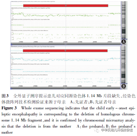 临床资料回顾性研究。患儿,男,1月龄时因“抽搐4 d”于2020年4月就诊于济南市儿童医院神经内分泌科。患儿入院前4 d(出生后27 d)出现抽搐发作,表现为意识丧失、双眼凝视、双侧上肢姿势维持,持续时间1 min左右,均为睡眠期发作,每日5~6次,在外未治疗。患儿系第2胎,第2产,胎龄40周自然顺产,出生体质量3.6 kg,母孕期无特殊病史,围生期无窒息、缺氧病史,家族史阴性。查体:体质量3.5 kg,头围35 cm,前囟5 cm×5 cm,头发稀少,圆脸,脸颊饱满,人中长,下颌小,皮下脂肪薄,心肺腹查体未见异常,四肢肌张力高,腱反射亢进,双侧拇指内收,双侧巴氏征阳性。实验室检查:血常规、生化、血浆乳酸、血浆氨、血尿质谱分析、眼底检查、脑脊液常规+生化均未见异常。脑电图示脑电成熟度延迟、多灶性放电(图1);头颅磁共振成像(MRI)显示:髓鞘化落后、脑室局部略饱满,视觉诱发电位示双侧P100波幅略低、重复性欠佳;染色体核型分析无异常。家系全外显子组测序示WWOX基因复合杂合变异:c.108-1G>A(父源,图2)和1.14 Mb片段缺失(母源,图3):chr16:77612522-78748376*1(包含NUDT7、VAT1L、CLEC3A、WWOX基因),结合患儿临床表现,判定为与患儿表型相关的致病性变异。根据患儿病史及实验室检查,初步诊断:癫痫、EOEE。给予托吡酯胶囊0.9 mg/(kg·d)口服,渐加量至 3.6 mg/(kg·d),发作略减少,2月龄时出现强直痉挛发作,复查脑电图示不典型高度失律(图1),托吡酯胶囊逐渐加量至7.2 mg/(kg·d),给予泼尼松[4 mg/(kg·d)]口服,2周后减量维持,2个月后停用,期间曾1个月无发作。4月龄时又出现发作,发作形式为强直发作、强直痉挛发作,遂加用左乙拉西坦口服液18.2 mg/(kg·d),逐渐加量至49.5 mg/(kg·d),丙戊酸钠口服液10.9 mg/(kg·d),逐渐加量至14.5 mg/(kg·d),仍频繁发作。末次随访6月龄,仍每日发作,发育无进步,体质量5.5 kg,身长 61 cm,头围41.5 cm,复查脑电图无改善(图1)。本研究通过医院医学伦理委员会批准(批准文号:ETYY-2020235),患儿监护人签署知情同意书。