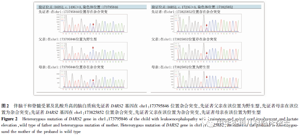 讨论LBSL是一种罕见的常染色体隐性遗传性脑白质病[9],多起病于儿童期和青少年期,少数在婴儿期或成年期起病,以缓慢进展的共济失调、痉挛、脊髓后索功能障碍为突出的临床表现,此外还包括构音障碍、癫痫、认知下降、括约肌功能障碍伴冲动性尿失禁、脑乳酸酸中毒等表现[10]。婴儿期起病者可表现为精神运动发育迟缓、小脑共济失调、早期肌张力低或痉挛,少数可有癫痫发作[5]。该患儿临床表现为精神发育迟滞、运动及语言发育迟缓、癫痫发作,与国外报道的婴儿期起病患儿临床表现相符[5]。LBSL的影像学表现较为独特,Scheper等[11]最初总结了38例患者的影像学资料,提出了LBSL的MRI诊断标准。既往也有报道婴儿期起病的患儿头部MRI表现不完全符合MRI诊断标准,早发型LBSL的影像学均有双侧大脑白质非均质异常信号,部分有脊髓后索或延髓锥体束异常信号,少数有颅内钙化灶或囊肿样变,未明确有无皮质萎缩[7]。可以假设以后可能有更多的DARS2基因突变患者可能被证实不完全符合MRI诊断标准。LBSL是常染色体隐性遗传病,致病基因是DARS2基因,位于1q25.1,基因产物为线粒体天冬氨酸tRNA 合成酶(mt-AspRS),mt-AspRS的功能是将线粒体内的天冬氨酸结合到其对应的tRNA上,mt-AspRS缺陷影响线粒体蛋白的合成而导致疾病的发生[12]。有学者提出错义突变可降低mt-AspRS的表达和酶活性、阻碍 mt-AspRS完成蛋白结构的二聚化过程[13]。亦有学者研究证实DARS2缺失会导致蒲肯野细胞退行性变[14]。本研究患儿DARS2基因测序发现2处变异,分别为第2外显子c.149G>A(p.R50Q)和第16外显子c.1723G>A(p.A575T),上述突变国际上均未见报道。国外报道的早发型LBSL患儿随访后约半数在早期死亡,提示早期发病可能预后不良。LBSL需与其他脑白质病相鉴别:(1)伴脑干与脊髓受累以及下肢痉挛的髓鞘发育不良:该病与LBSL相似,为常染色体隐性遗传病,致病基因为DARS,其编码细胞质AspRS,该病常始于婴幼儿期的发育落后、痉挛性瘫痪、认知相对正常,头颅MRI病变特点与LBSL类似,基因检测可协助鉴别。(2)髓鞘低下性脑白质营养不良:是一类中枢神经系统白质髓鞘形成障碍性疾病,是遗传性疾病,分多种亚型,其中HLD3型婴儿期起病,合并癫痫、喂养困难、发育落后、小头畸形等,神经影像学提示脑萎缩和髓鞘化低下,基因检测可发现致病基因突变[15]。综上,本研究首次诊断国内早发型LBSL,发现了2个未见报道的DARS2基因变异位点,丰富了DARS2基因变异数据库,同时通过本例及文献报道,增强广大医师对LBSL的认识。该疾病的确诊依赖于MRI检查及基因学诊断,因此对于该类疾病应及早完善基因学检查明确病因,以便于明确诊断、判断预后,同时对受累家庭提供遗传学咨询。