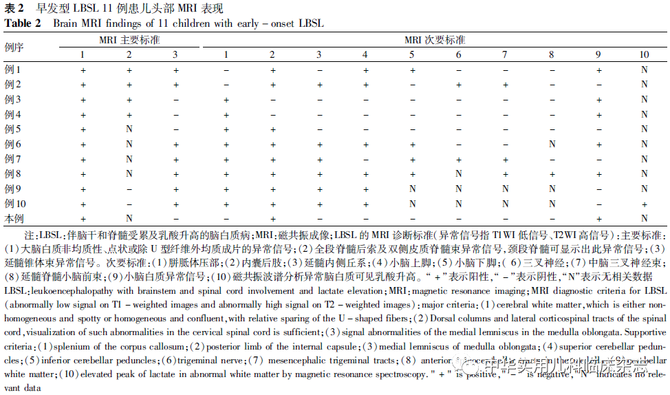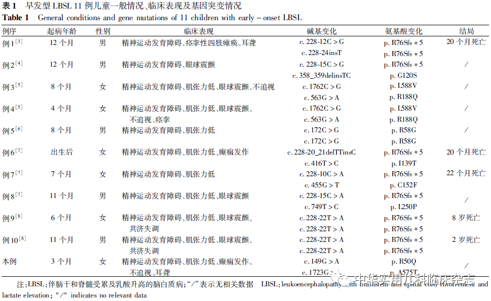 文献检索分析以“脑白质病、DARS2基因、早发型”或“leukoencephalopathy、DARS2 gene、early-onset”为检索词查阅万方数据库、中国期刊全文数据库、维普数据库, PubMed数据库、Medline生物医学数据库(截至2020年10月),共检索到6篇10例DARS2基因变异所致早发型LBSL患者[3-8]。国外文献中10例患儿和本例先证者共11例患儿的一般情况及基因结果见表1,影像学结果见表2。